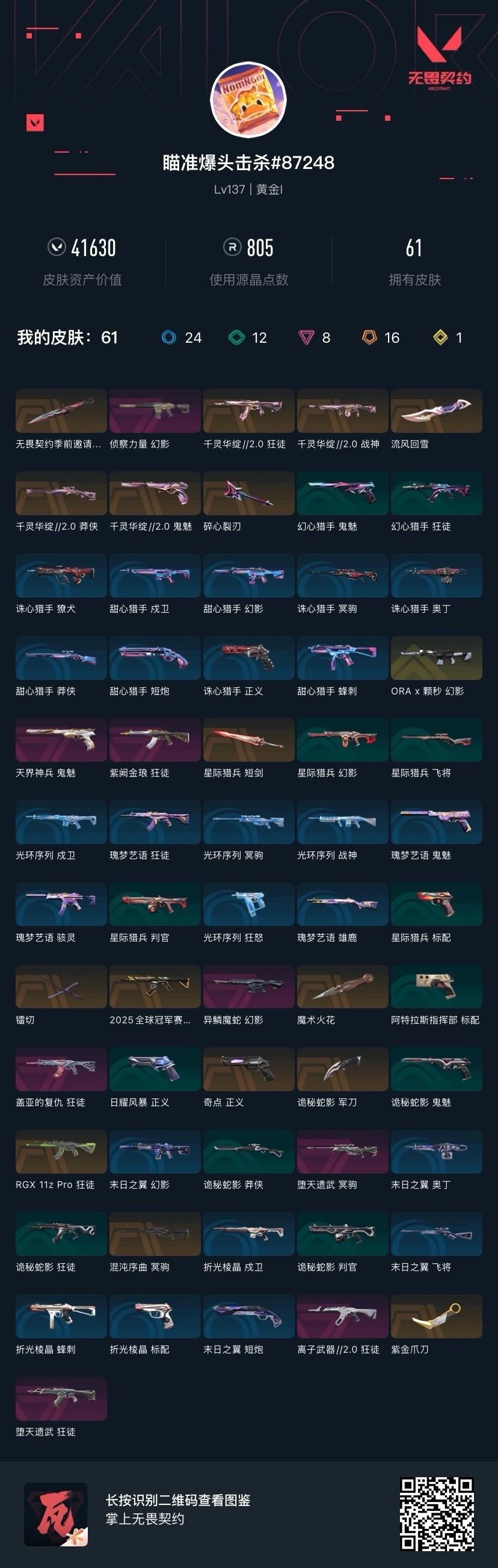 16橙皮 1金皮 8紫皮 61皮肤 28英雄 82卡面 805已用源晶 黄金段位 【亮点皮肤】悲悯之刃 【套装】千灵华绽//2.0 套装 【近战武器皮肤】魔术火花诡秘蛇影镭切星际猎兵 短剑碎心裂刃流风回雪悲悯之刃紫金爪刀 【佩呛皮肤】鬼魅-千灵华绽//2.0正义-奇点鬼魅-天界神
