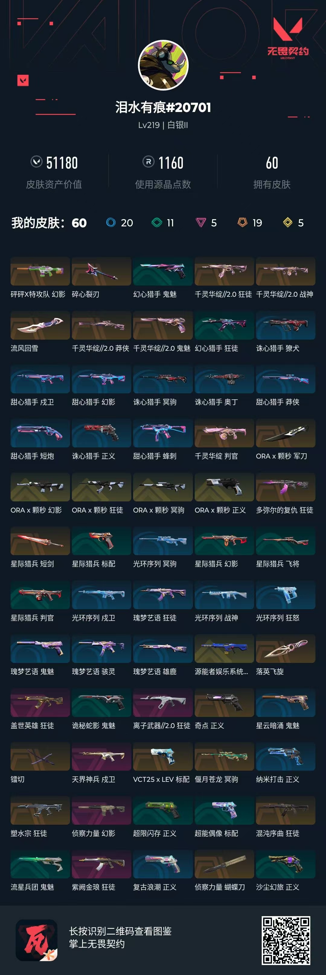 [16470560]s193471(a-x-颗秒套装/千灵华绽//2.0套装)无畏契约/219等级/白银段位/22英雄/60皮肤/资产51180/已使用r点1160/剩余r点0/a-x-颗秒-狂徒a-x-颗秒-幻影a-x-颗秒-冥驹a-x-颗秒-正义a-x-颗秒-军刀,千灵华绽//2.0-狂徒千灵华绽//2.0-战神千灵华绽//2.0-莽侠千灵华绽//2.0-鬼魅流风回雪,多弥尔的复仇-狂徒,混沌序曲-狂徒,塑水宗-狂徒,砰砰x特攻队-幻影,源能者娱乐系统-幻影,离子武器//2.0-狂徒,天界神兵-戍卫,盖世英雄-狂徒,紫阙金琅-狂徒,侦察力量-幻影,碎心裂刃,星际猎兵-短剑,镭切,落英飞旋,侦察力量-蝴蝶刀,偃月苍龙-冥驹,千灵华绽-判官,vct25-x-lev-标配,奇点-正义