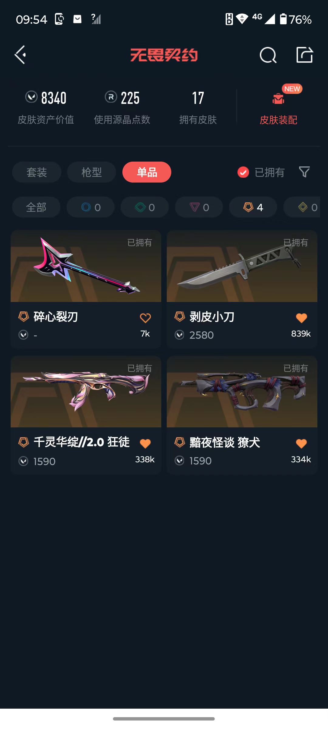 [16471487]s193472 无畏契约/34等级/黄金段位/10英雄/17皮肤/资产8340/已使用r点225/剩余r点25/千灵华绽//2.0-狂徒,黯夜怪谈-獠犬,碎心裂刃,剥皮小刀,天界神兵//2.0-判官,侦察力量-鬼魅
