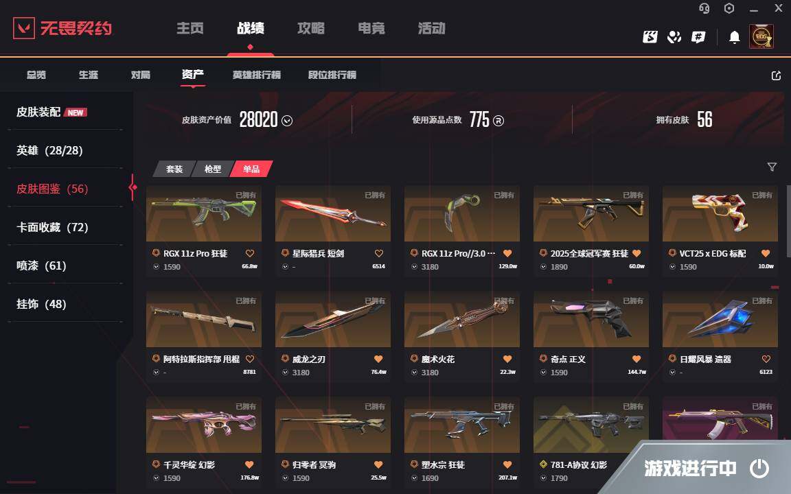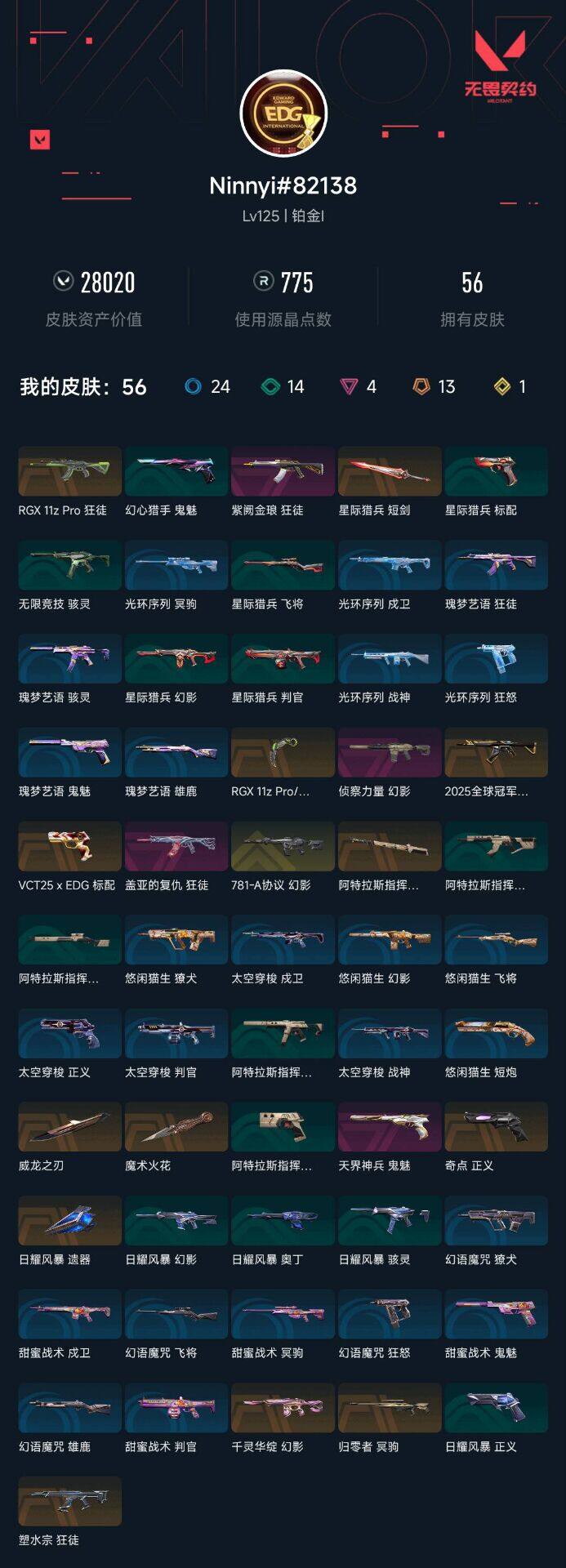 [16472287]【编号26184 可秒换绑】【店长推荐超值精氪毕业号!不用再充钱了!!!!】 【英雄】:幻棱,炼狱,维斯,暮蝶,钛狐,壹决,铁臂,捷风,雷兹,幽影,不死鸟,贤者,猎枭,蝰蛇,零,芮娜,奇乐,尚勃勒,霓虹,斯凯,夜露,星礈,k/o,海神,盖可,黑梦,钢锁 【近战 武器】:近战武器-魔术火花,近战武器-rgx 11z pro//3.0 爪刀,近战武器-威龙之刃,近战武器-日耀风暴 遗器,近战武器-阿特拉斯指挥部 甩棍,近战武器-星际猎兵 短剑,近战武器-魔术火花 【狂徒】:狂徒-2025全球冠军赛,狂徒-塑水宗,狂徒-rgx 11z pro,狂徒-盖亚的复仇,狂徒-紫阙金琅 【幻影】:幻影-781-a协议,幻影-千灵华绽,幻影-侦察力量 【冥驹】:冥驹-归零者 【骇灵】:骇灵-无限竞技 【vct手呛】:标配-vct25 x edg 【正义】:正义-奇点 【鬼魅】:鬼魅-天界神兵 【卡面】:clutch 卡面,无畏契约go!第一卷:芮娜 卡面,无畏契约go!第一卷:零 卡面,《双城之战》金克丝 卡面,代号红色 卡面,新兵报到 卡面,v契约 卡面,无畏契约 卡面 【喷漆】:捷风差距 喷漆,买装还是存钱 喷漆,胜利属于无畏契约 喷漆,glhf 喷漆,无畏契约 喷漆 【挂饰】:无畏契约go!第一卷 芮娜 挂饰,无畏契约go!第一卷 零 挂饰,vct x edg 挂饰,天外飞客 挂饰,无畏契约 纪念币 挂饰
