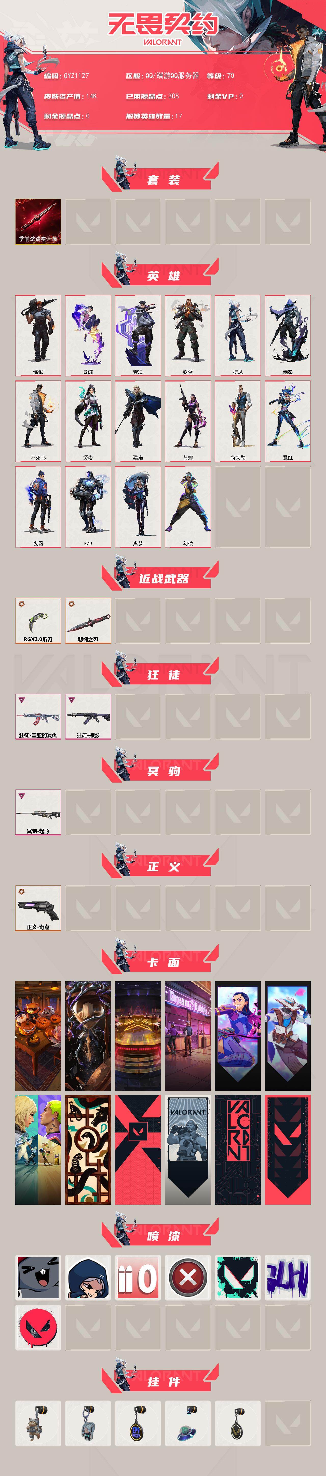 【qyz1127】终极4/卓越3/皮肤9/等级70/段位:黑铁/无畏契约季前邀请赛套装/幻棱/炼狱/暮蝶/壹决/铁臂/捷风/幽影/不死鸟/贤者/猎枭/芮娜/尚勃勒/霓虹/夜露/k/o/黑梦/近战武器-无畏契约季前邀请赛 悲悯之刃/近战武器-rgx 11z pro//3.0 爪刀/狂徒-掠影/狂徒-盖亚的复仇/冥驹-起源/正义-奇点/南瓜盛典 卡面/时间到 卡面/最高舞台 卡面/梦幻奶茶 卡面/无畏契约go!第一卷:芮娜 卡面/无畏契约go!第一卷:零 卡面/钢锁vs盖可 卡面/萌彩剪影 卡面/代号红色 卡面/新兵报到 卡面/v契约 卡面/无畏契约 卡面/超级粉丝 喷漆/捷风差距 喷漆/拼一呛 喷漆/买装还是存钱 喷漆/胜利属于无畏契约 喷漆/glhf 喷漆/无畏契约 喷漆/猫猫木乃伊 挂饰/袖珍捷风 挂饰/第九季//第一幕 纪念币 挂饰/天外飞客 挂饰/无畏契约 纪念币 挂饰