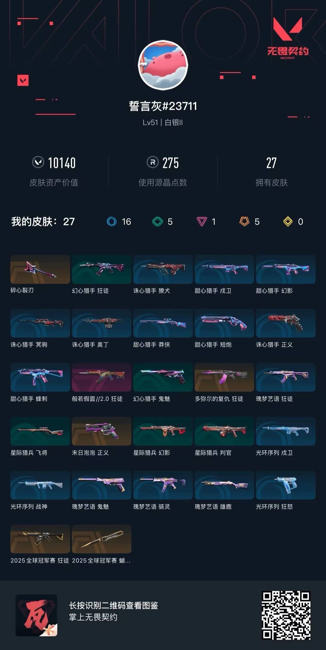 [16463226]5橙皮 1紫皮 27皮肤 15英雄 45卡面 275已用源晶 白银段位 【套装】2025全球冠军赛 【近战武器皮肤】2025全球冠军赛 蝴蝶刀碎心裂刃 【佩呛皮肤】正义-末日泡泡 【步呛皮肤】狂徒-般若假面//2.0多弥尔的复仇 狂徒2025全球冠军赛 狂徒 【挂饰】2025全球冠军赛挂饰v26第一幕纪念币 挂饰