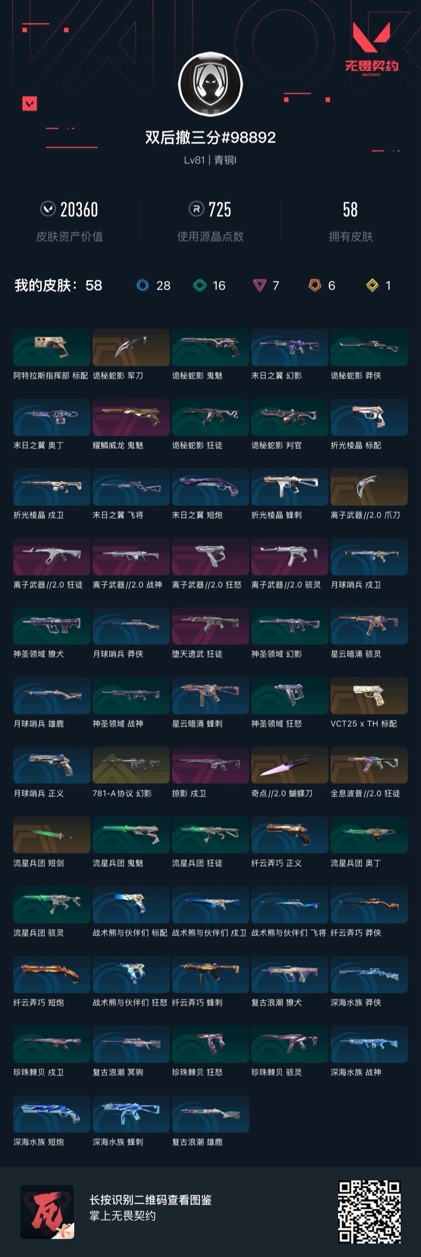 [16467055]6橙皮 1金皮 7紫皮 58皮肤 28英雄 84卡面 725已用源晶 青铜段位 【套装】离子武器2.0 【近战武器皮肤】诡秘蛇影短剑-流星兵团蝴蝶刀-奇点//2.0离子武器2.0 爪刀 【佩呛皮肤】标配-vct25xth狂怒-离子武器2.0鬼魅-耀鳞威龙 【冲锋呛皮肤】骇灵-离子武器2.0 【步呛皮肤】狂徒-离子武器2.0戍卫-掠影狂徒-全息波普//2.0狂徒-堕天遗武幻影-781-a协议 【机呛皮肤】战神-离子武器2.0 【挂饰】薰衣草之心挂饰神中神挂饰传世莲华挂饰vctxth挂饰云开见日挂饰迷你机甲挂饰