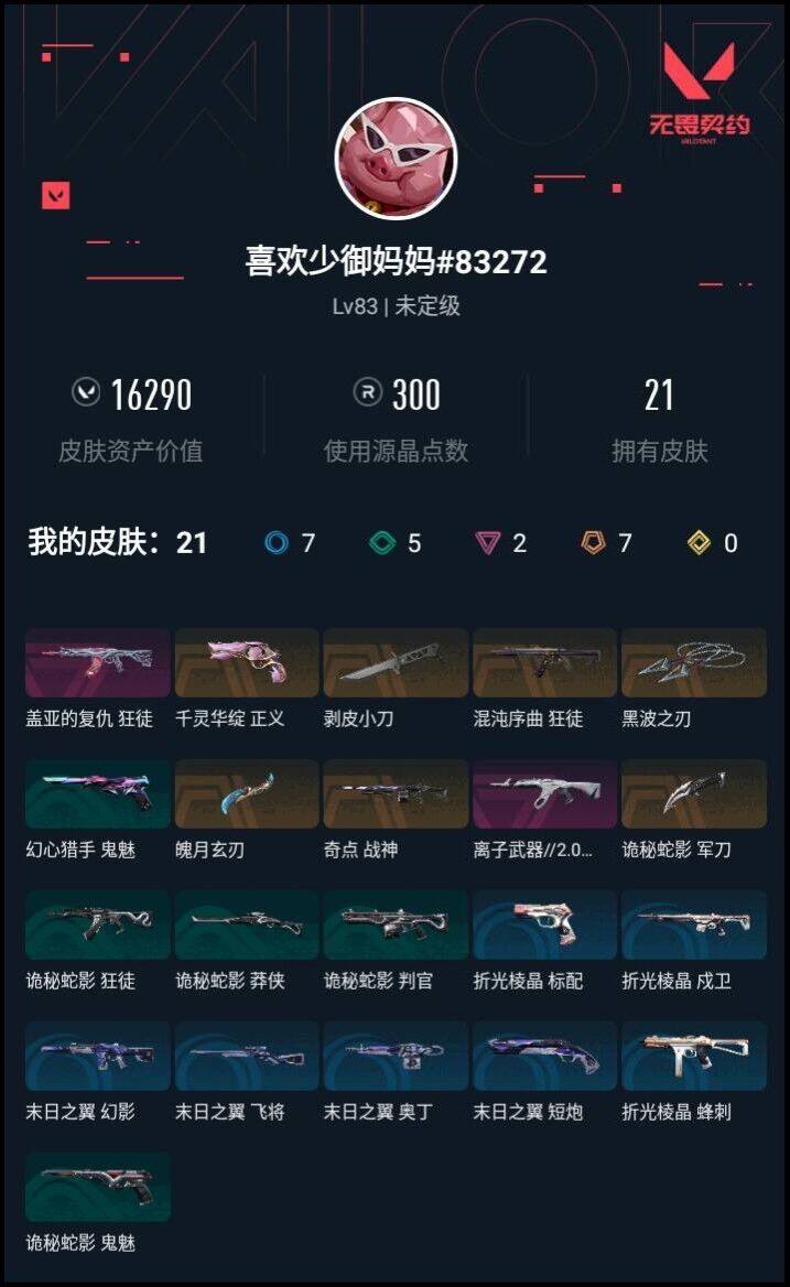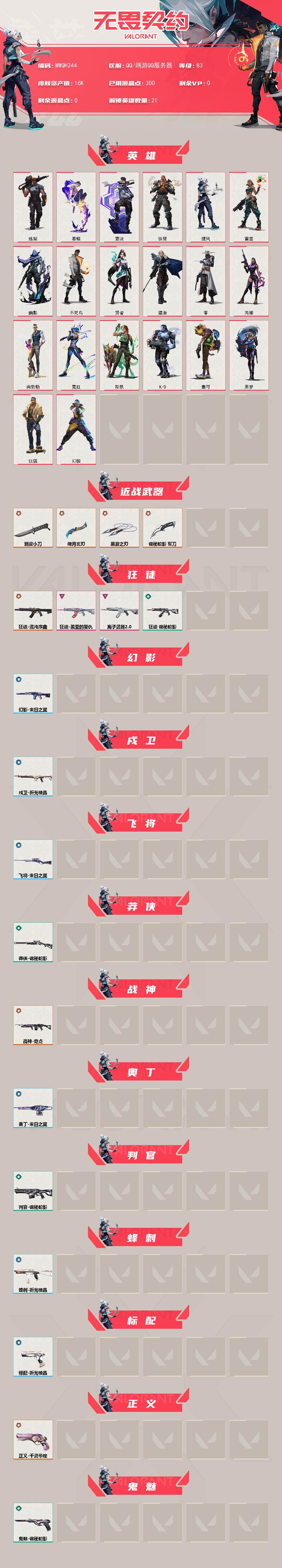 【wwqh244】终极7/卓越2/皮肤21/等级83/段位:未定级/幻棱/炼狱/暮蝶/钛狐/壹决/铁臂/捷风/雷兹/幽影/不死鸟/贤者/猎枭/零/芮娜/尚勃勒/霓虹/斯凯/k/o/盖可/黑梦/近战武器-剥皮小刀/近战武器-黑波之刃/近战武器-魄月玄刃/近战武器-诡秘蛇影 军刀/狂徒-混沌序曲/狂徒-盖亚的复仇/狂徒-离子武器//2.0/狂徒-诡秘蛇影/幻影-末日之翼/戍卫-折光棱晶/飞将-末日之翼/莽侠-诡秘蛇影/战神-奇点/奥丁-末日之翼/判官-诡秘蛇影/蜂刺-折光棱晶/标配-折光棱晶/正义-千灵华绽/鬼魅-诡秘蛇影/短炮-末日之翼/南瓜盛典 卡面/归乡 // 蝰蛇 卡面/战术小伙伴的夏日 卡面/沙雕爆能器 卡面/无畏契约go!第一卷:芮娜 卡面/无畏契约go!第一卷:零 卡面/代号红色 卡面/新兵报到 卡面/v契约 卡面/无畏契约 卡面/买装还是存钱 喷漆/胜利属于无畏契约 喷漆/glhf 喷漆/无畏契约 喷漆/第九季//第三幕 纪念币 挂饰/天外飞客 挂饰/无畏契约 纪念币 挂饰