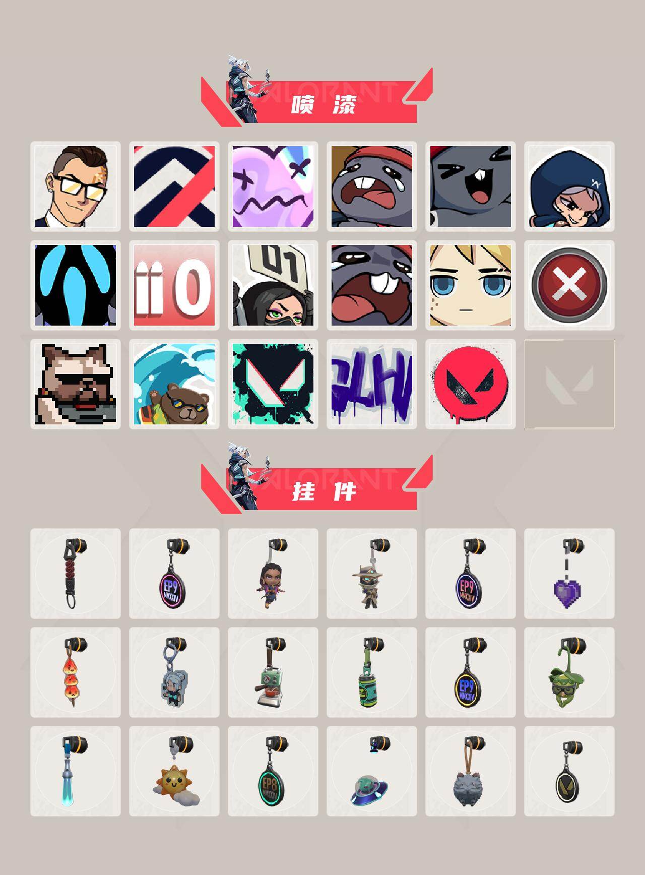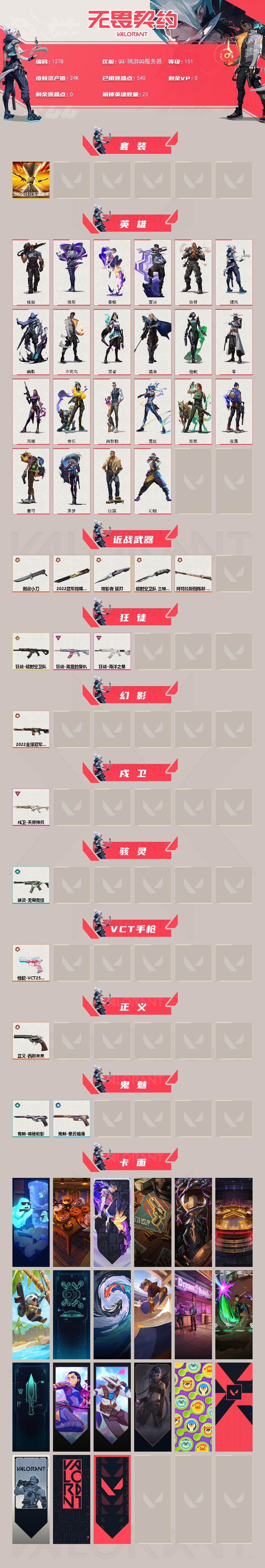 【套装】:2022全球冠军赛套装 【英雄】:幻棱,炼狱,维斯,暮蝶,钛狐,壹决,铁臂,捷风,幽影,不死鸟,贤者,猎枭,蝰蛇,零,芮娜,奇乐,尚勃勒,霓虹,斯凯,夜露,盖可,黑梦 【近战武器】:近战武器-2022全球冠军赛 蝴蝶刀,近战武器-超时空卫队 三棱军刺,近战武器-剥皮小刀,近战武器-噬影者 簇刃,近战武器-阿特拉斯指挥部 甩棍 【狂徒】:狂徒-超时空卫队,狂徒-盖亚的复仇,狂徒-海洋之星 【幻影】:幻影-2022全球冠军赛 【戍卫】:戍卫-天界神兵 【骇灵】:骇灵-无限竞技 【vct手呛】:标配-vct25 x blg 【正义】:正义-西部未来 【鬼魅】:鬼魅-诡秘蛇影,鬼魅-星云暗涌 【卡面】:精灵大战 卡面,南瓜盛典 卡面,无畏契约:暮蝶 卡面,正义的化身 卡面,时间到 卡面,最高舞台 卡面,树懒大作战 卡面,声感陷阱设计图 卡面,红鳞松叶 卡面,clutch 卡面,梦幻奶茶 卡面,源能反应 卡面,零点嗅探设计图 卡面,无畏契约go!第一卷:芮娜 卡面,无畏契约go!第一卷:零 卡面,《双城之战》金克丝 卡面,战术小伙伴 卡面,代号红色 卡面,新兵报到 卡面,v契约 卡面,无畏契约 卡面 【喷漆】:小小心意 喷漆,控场勿近 喷漆,伤心心 喷漆,熊抱 喷漆,超级粉丝 喷漆,捷风差距 喷漆,惊声尖叫 喷漆,拼一呛 喷漆,我觉得不行 喷漆,我的刀呢? 喷漆,当然可以 喷漆,买装还是存钱 喷漆,关门放狗 喷漆,酷熊冲浪 喷漆,胜利属于无畏契约 喷漆,glhf 喷漆,无畏契约 喷漆 【挂饰】:v25第六幕:超凡 挂饰,伞绳 挂饰,第九季//第三幕 纪念币 挂饰,无畏契约go!第一卷 芮娜 挂饰,无畏契约go!第一卷 零 挂饰,第九季//第二幕 纪念币 挂饰,薰衣草之心 挂饰,糖葫芦 挂饰,袖珍捷风 挂饰,迷你浓缩 挂饰,z世代特饮 挂饰,第九季//第一幕 纪念币 挂饰,战术河童 挂饰,荧光棒 挂饰,云开见日 挂饰,第八季//第三幕 纪念币 挂饰,天外飞客 挂饰,《双城之战》魄罗 挂饰,无畏契约 纪念币 挂饰