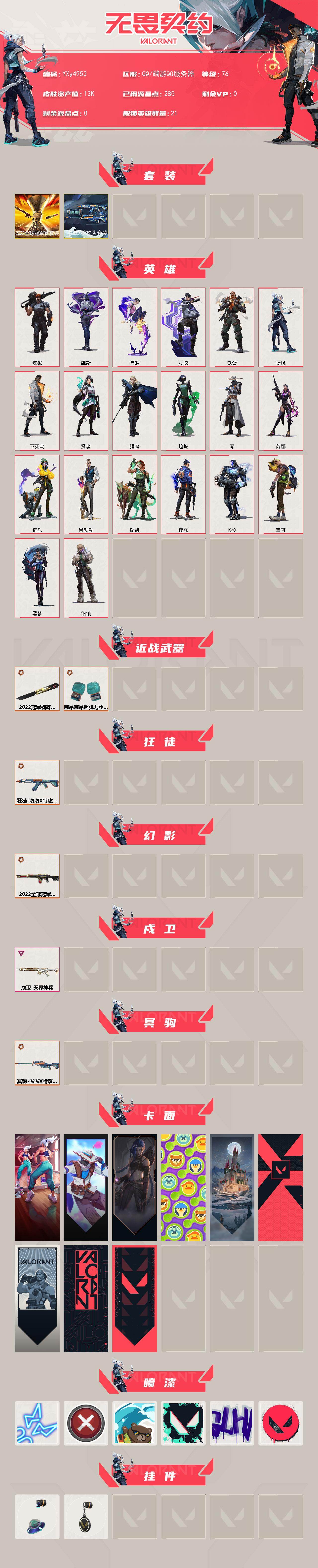 【套装】:2022全球冠军赛套装,滋滋x特攻队套装 【英雄】:炼狱,维斯,暮蝶,壹决,铁臂,捷风,不死鸟,贤者,猎枭,蝰蛇,零,芮娜,奇乐,尚勃勒,斯凯,夜露,k/o,盖可,黑梦,钢锁 【近战武器】:近战武器-2022全球冠军赛 蝴蝶刀,近战武器-嘟昂嘟昂超弹力水球拳套 【狂徒】:狂徒-滋滋x特攻队 【幻影】:幻影-2022全球冠军赛 【戍卫】:戍卫-天界神兵 【冥驹】:冥驹-滋滋x特攻队 【