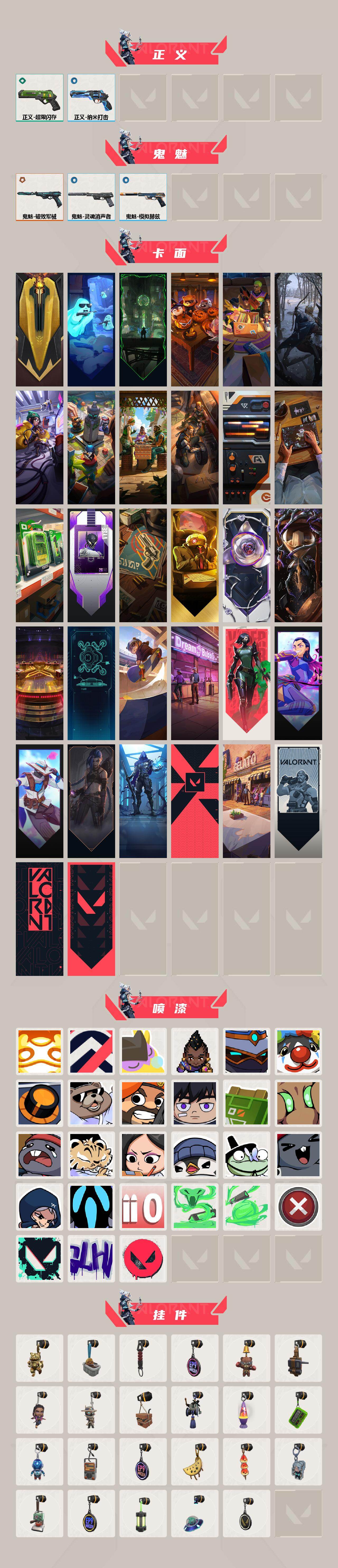 【英雄】:幻棱,炼狱,维斯,暮蝶,钛狐,壹决,铁臂,捷风,雷兹,幽影,不死鸟,贤者,猎枭,蝰蛇,零,芮娜,奇乐,尚勃勒,霓虹,斯凯,夜露,星礈,k/o,海神,盖可,黑梦,钢锁 【近战武器】:近战武器-a x 颗秒 军刀,近战武器-紫金爪刀,近战武器-超限闪存 匕首 【狂徒】:狂徒-光明哨兵,狂徒-混沌序曲,狂徒-多弥尔的复仇,狂徒-千灵华绽//2.0 【幻影】:幻影-砰砰x特攻队,幻影-全息波普//2.0,幻影-侦察力量,幻影-超限闪存 【戍卫】:戍卫-浮光跃金 【獠犬】:獠犬-模拟赫兹 【冥驹】:冥驹-离子武器,冥驹-起源,冥驹-模拟赫兹 【莽侠】:莽侠-超限闪存 【战神】:战神-浮光跃金 【雄鹿】:雄鹿-模拟赫兹 【骇灵】:骇灵-浮光跃金 【蜂刺】:蜂刺-超限闪存 【标配】:标配-超能偶像,标配-浮光跃金 【正义】:正义-超限闪存,正义-纳米打击 【鬼魅】:鬼魅-破败军械,鬼魅-灵魂消声者,鬼魅-模拟赫兹 【卡面】:进入射程 卡面,精灵大战 卡面,欢迎来到底城 卡面,南瓜盛典 卡面,唱片的故事 卡面,钢弓与箭弦 卡面,排除故障 卡面,战术桌游 卡面,悠享食光 卡面,修车达人 卡面,模拟赫兹 卡面,浮光跃金 卡面,超限闪存 卡面,维斯工牌 卡面,正义的化身 卡面,终章:生意人麦宝 卡面,铁之华 卡面,时间到 卡面,最高舞台 卡面,声感陷阱设计图 卡面,clutch 卡面,梦幻奶茶 卡面,无畏契约:蝰蛇 卡面,无畏契约go!第一卷:芮娜 卡面,无畏契约go!第一卷:零 卡面,《双城之战》金克丝 卡面,暗呛 卡面,代号红色 卡面,冰淇淋店 卡面,新兵报到 卡面,v契约 卡面,无畏契约 卡面 【喷漆】:嗨宝南瓜灯 喷漆,控场勿近 喷漆,皮蛋呼呼 喷漆,像素星礈 喷漆,图谋不轨的零 喷漆,小丑猫 喷漆,模拟赫兹 喷漆,高丽风情小熊 喷漆,蹲到一个 喷漆,全力集中 喷漆,超限闪存 喷漆,rua一下 喷漆,熊抱 喷漆,高丽风情小虎 喷漆,记在小本本 喷漆,防弹企鹅 喷漆,高丽风情小蛙 喷漆,超级粉丝 喷漆,捷风差距 喷漆,惊声尖叫 喷漆,拼一呛 喷漆,致命毒素 喷漆,喜欢哪种毒? 喷漆,买装还是存钱 喷漆,胜利属于无畏契约 喷漆,glhf 喷漆,无畏契约 喷漆 【挂饰】:v25第六幕:超凡 挂饰,终章:猫猫木乃伊 挂饰,悠闲鸡块 挂饰,伞绳 挂饰,第九季//第三幕 纪念币 挂饰,拳击战术熊 挂饰,工具腰带 挂饰,无畏契约go!第一卷 芮娜 挂饰,无畏契约go!第一卷 零 挂饰,暗藏猫腻 挂饰,高丽风情 挂饰,熔岩灯 挂饰,超限闪存 挂饰,迷你k/o 挂饰,模拟赫兹 挂饰,第九季//第二幕 纪念币 挂饰,终章:这瓜保熟 挂饰,糖葫芦 挂饰,袖珍捷风 挂饰,迷你浓缩 挂饰,第九季//第一幕 纪念币 挂饰,化学容器 挂饰,天外飞客 挂饰,无畏契约 纪念币 挂饰