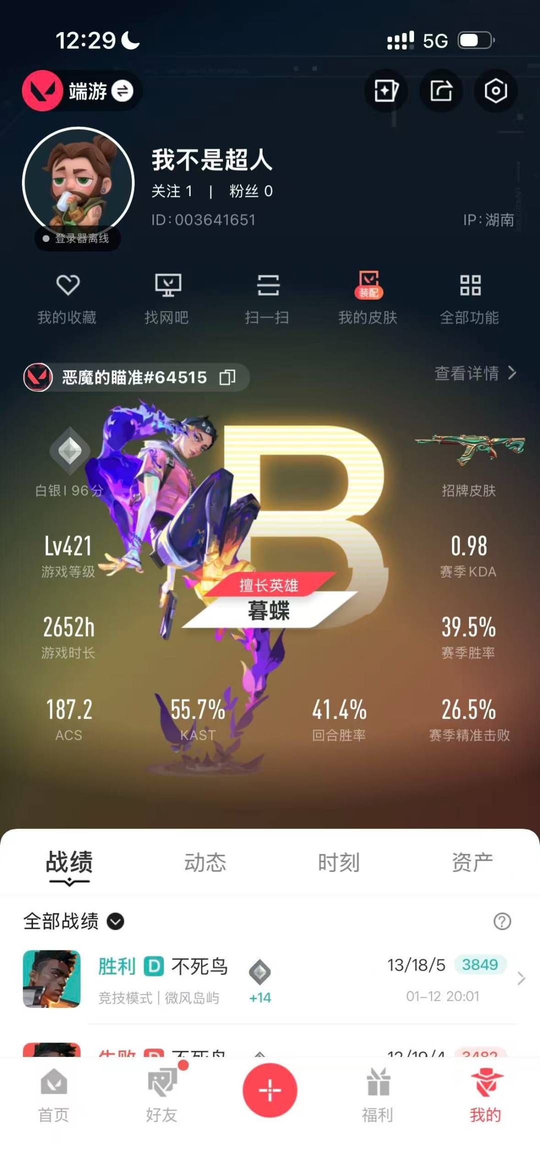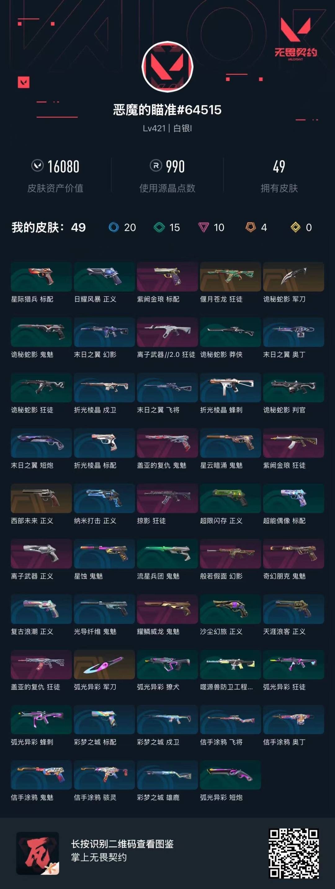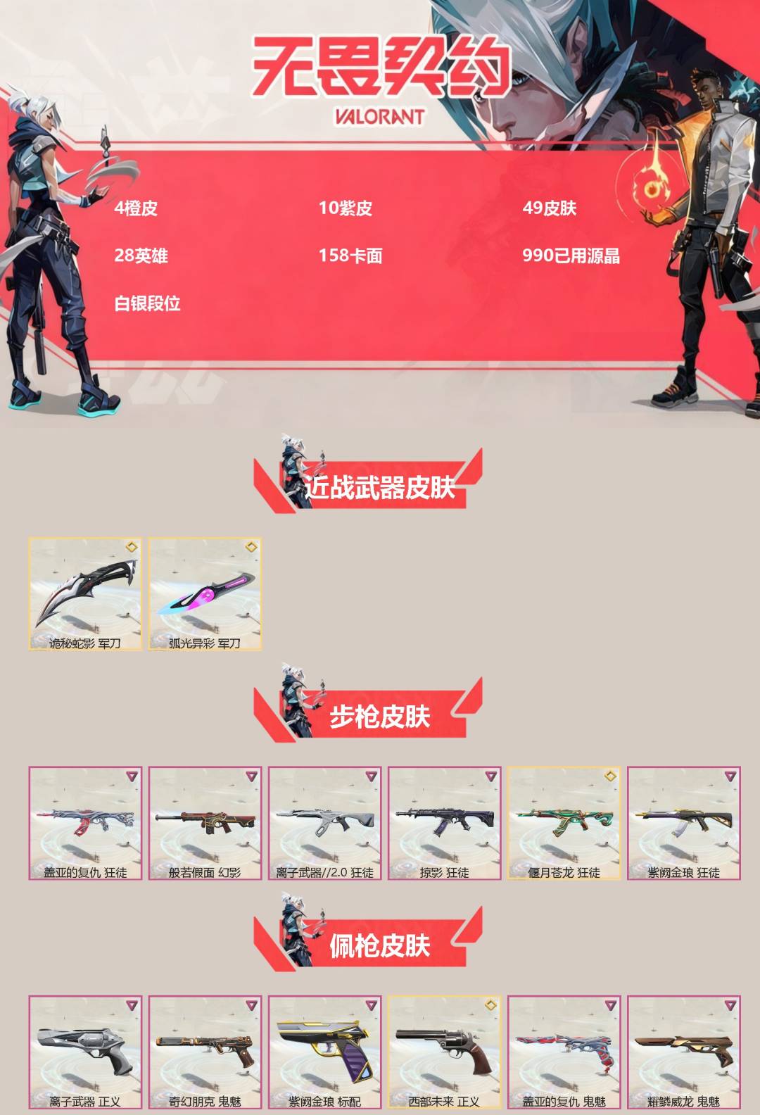 4橙皮 10紫皮 49皮肤 28英雄 158卡面 990已用源晶 白银段位 【近战武器皮肤】诡秘蛇影军刀-弧光异彩 【佩呛皮肤】正义-西部未来正义-离子武器鬼魅-盖亚的复仇鬼魅-耀鳞威龙鬼魅-奇幻朋克标配-紫阙金琅 【步呛皮肤】狂徒-离子武器2.0狂徒-掠影狂徒-紫阙金琅狂徒-盖