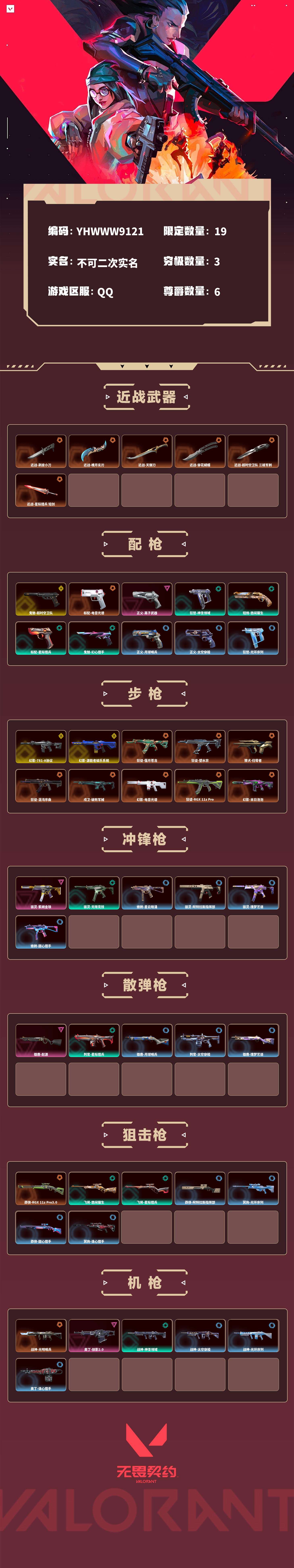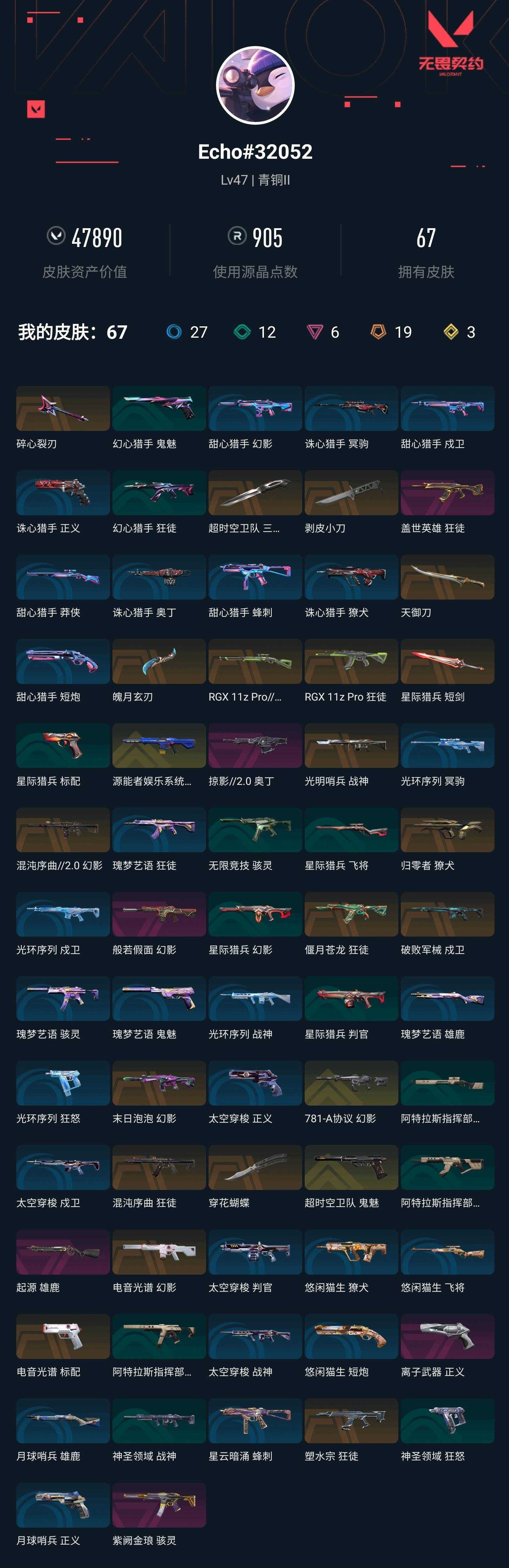 【无畏契约】【yhwww9121】等级:47,已用无畏点47890,已用源晶点905,金皮:幻影-781-a协议|幻影-源能者娱乐系统|鬼魅-超时空卫队__橙皮:近战-剥皮小刀|近战-魄月玄刃|近战-天御刀|莽侠-rgx 11z pro3.0|狂徒-偃月苍龙|狂徒-塑水宗|獠犬-归零者|狂徒-混沌序曲|戍卫-破败军械|战神-光明哨兵|近战-穿花蝴蝶|标配-电音光谱|幻影-电音光谱|狂徒-rgx 11z pro|近战-超时空卫队 三棱军刺|近战-星际猎兵 短剑|幻影-末日泡泡|幻影-混沌序曲2.0__紫皮:骇灵-紫阙金琅|幻影-般若假面|狂徒-盖世英雄|正义-离子武器|雄鹿-起源|奥丁-掠影2.0__段位:青铜__绿皮:骇灵-无限竞技|狂怒-神圣领域|战神-神圣领域|短炮-悠闲猫生|飞将-悠闲猫生|獠犬-悠闲猫生|判官-星际猎兵|飞将-星际猎兵|标配-星际猎兵|狂徒-幻心猎手|鬼魅-幻心猎手__蓝皮:正义-月球哨兵|雄鹿-月球哨兵|蜂刺-星云暗涌|正义-太空穿梭|战神-太空穿梭|判官-太空穿梭|戍卫-太空穿梭|骇灵-阿特拉斯指挥部|莽侠-阿特拉斯指挥部|狂徒-阿特拉斯指挥部|狂怒-光环序列|戍卫-光环序列|冥驹-光环序列|战神-光环序列|狂徒-瑰梦艺语|鬼魅-瑰梦艺语|骇灵-瑰梦艺语|雄鹿-瑰梦艺语|蜂刺-甜心猎手|短炮-甜心猎手|莽侠-甜心猎手|幻影-甜心猎手|戍卫-甜心猎手|正义-诛心猎手|冥驹-诛心猎手|獠犬-诛心猎手|奥丁-诛心猎手__英雄:暮蝶|霓虹|壹决|k/o|炼狱|贤者|猎枭|芮娜|零|捷风|不死鸟|禁灭