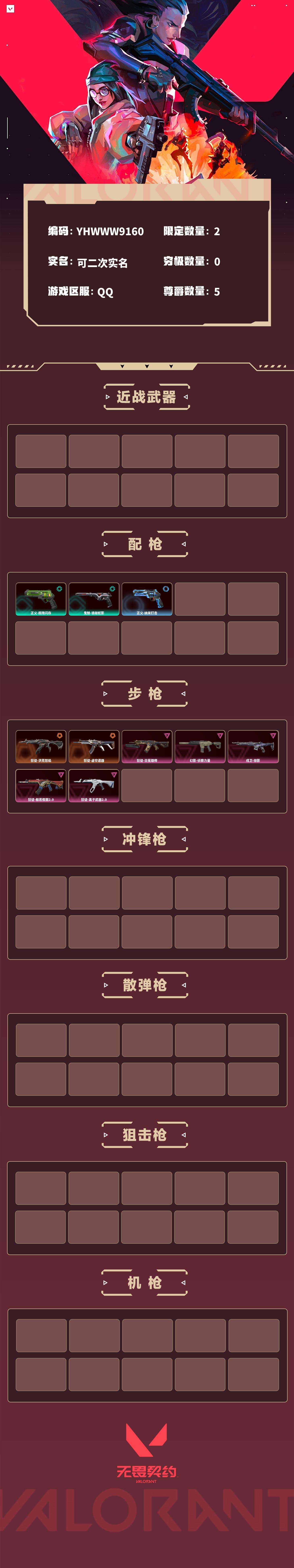 【无畏契约】【yhwww9160】等级:86,已用无畏点9630,已用源晶点365,橙皮:狂徒-洪荒怒焰|狂徒-虚空遗器__紫皮:狂徒-日冕雄师|幻影-侦察力量|戍卫-掠影|狂徒-般若假面2.0|狂徒-离子武器2.0__段位:黄金__蓝皮:正义-纳米打击__绿皮:正义-超限闪存|鬼魅-诡秘蛇影__英雄:尚勃勒|维斯|黑梦|暮蝶|盖可|霓虹|壹决|星礈|k/o|幽影|夜露|钢锁|海神|奇乐|炼狱|铁臂|贤者|猎枭|钛狐|芮娜|零|捷风|不死鸟|幻棱|雷兹|禁灭