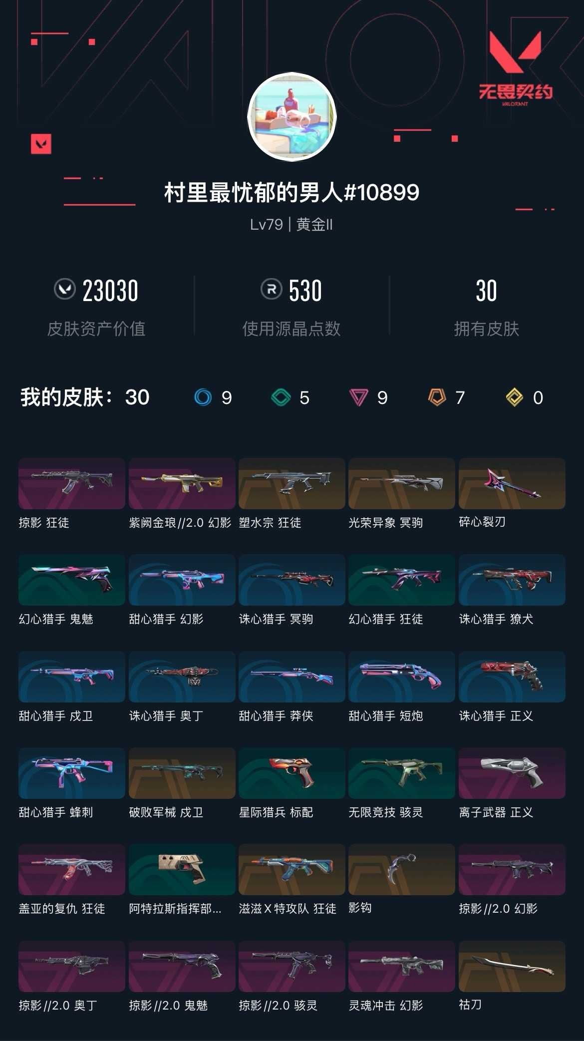 【无畏契约】【yhwww9158】等级:79,已用无畏点23030,已用源晶点530,橙皮:近战-祜刀|狂徒-塑水宗|戍卫-破败军械|狂徒-滋滋x特攻队|近战-影钩__紫皮:幻影-灵魂冲击|幻影-紫阙金琅2.0|狂徒-盖亚的复仇|正义-离子武器|狂徒-掠影|骇灵-掠影2.0|奥丁-掠影2.0|鬼魅-掠影2.0|幻影-掠影2.0__段位:黄金__绿皮:骇灵-无限竞技|标配-星际猎兵|狂徒-幻心猎手|鬼魅-幻心猎手__蓝皮:标配-阿特拉斯指挥部|蜂刺-甜心猎手|短炮-甜心猎手|莽侠-甜心猎手|幻影-甜心猎手|戍卫-甜心猎手|正义-诛心猎手|冥驹-诛心猎手|獠犬-诛心猎手|奥丁-诛心猎手__英雄:尚勃勒|维斯|黑梦|斯凯|暮蝶|盖可|霓虹|壹决|k/o|幽影|夜露|钢锁|奇乐|炼狱|铁臂|贤者|猎枭|芮娜|零|捷风|不死鸟|幻棱|雷兹|禁灭