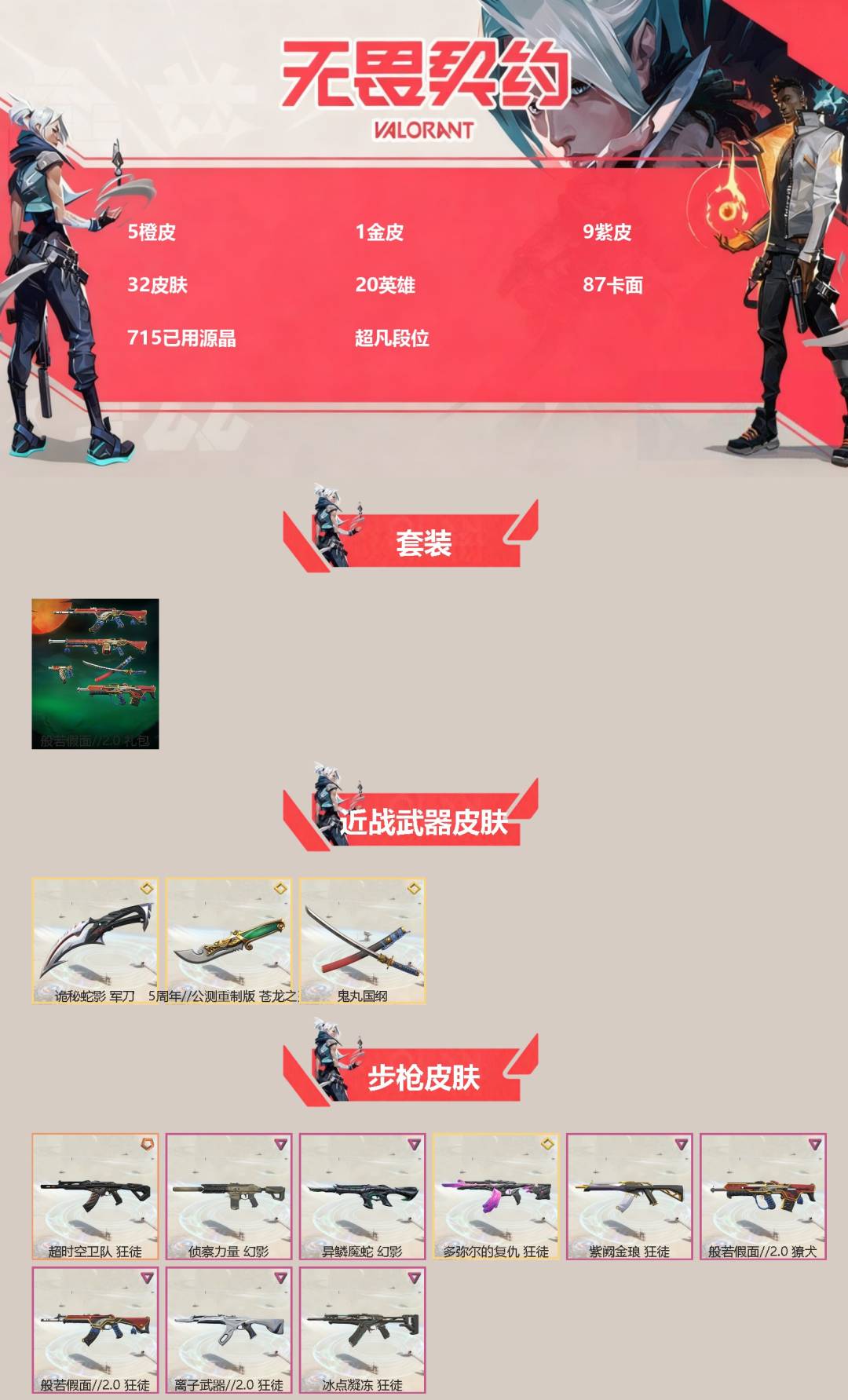 5橙皮 1金皮 9紫皮 32皮肤 20英雄 87卡面 715已用源晶 超凡段位 【套装】般若假面//2.0套装 【近战武器皮肤】鬼丸国纲诡秘蛇影苍龙之刃 【佩呛皮肤】狂怒-般若假面//2.0正义-西部未来 【步呛皮肤】狂徒-离子武器2.0幻影-异鳞魔蛇獠犬-般若假面//2.0狂徒-般若