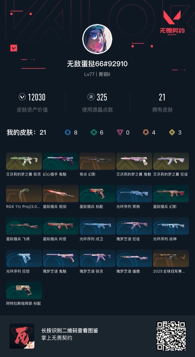[16507552]4橙皮 3金皮 21皮肤 21英雄 37卡面 325已用源晶 青铜段位 【近战武器皮肤】星际猎兵 短剑爪刀-rgx 11z pro 3.0 【佩呛皮肤】鬼魅-艾沃莉的梦之翼 【冲锋呛皮肤】骇灵-艾沃莉的梦之翼 【步呛皮肤】2025全球冠军赛 狂徒狂徒-艾沃莉的梦之翼幻影-奇点 【挂饰】薰衣草之心挂饰v26第一幕纪念币 挂饰