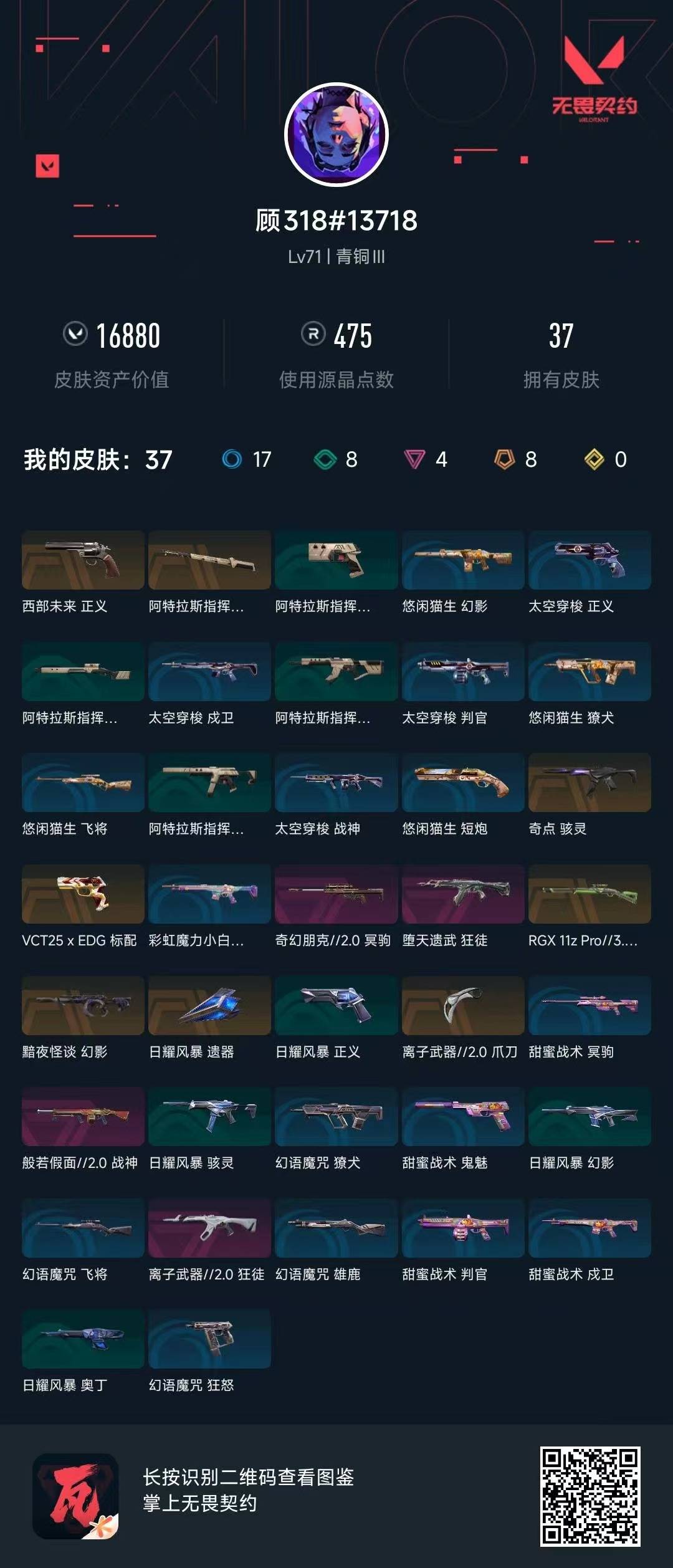 [16508379]8橙皮 4紫皮 37皮肤 19英雄 48卡面 475已用源晶 青铜段位 【近战武器皮肤】:离子武器2.0 爪刀阿特拉斯指挥部 【佩呛皮肤】:标配-vct25xedg正义-西部未来 【冲锋呛皮肤】:骇灵-奇点 【步呛皮肤】:幻影-黯夜怪谈狂徒-离子武器2.0狂徒-堕天遗武 【狙击呛皮肤】:冥驹-奇幻朋克2.0莽侠-rgx 11z pro 3.0 【机呛皮肤】:战神-般若假面//2.0 【挂饰】:双城之战魄罗挂饰v25第三幕:黑铁 挂饰vctxedg挂饰