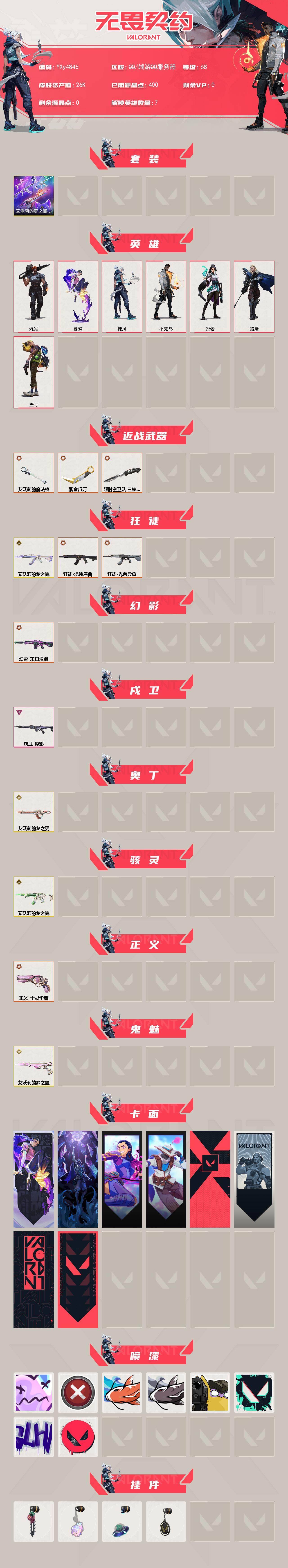 【2.6w库存猫猫全套.三棱军刺.紫金爪.混沌.光荣异象.末日泡泡.莲花正义】y4846【可二次】【因赛季更新游戏段付以上号为准!】 【套装】:艾沃莉的梦之翼套装 【英雄】:炼狱,暮蝶,捷风,不死鸟,贤者,猎枭,盖可 【近战武器】:近战武器-超时空卫队 三棱军刺,近战武器-紫金爪刀,近战武器-艾沃莉的魔法棒 【狂徒】:狂徒-艾沃莉的梦之翼,狂徒-混沌序曲,狂徒-光荣异象 【幻影】:幻影-末