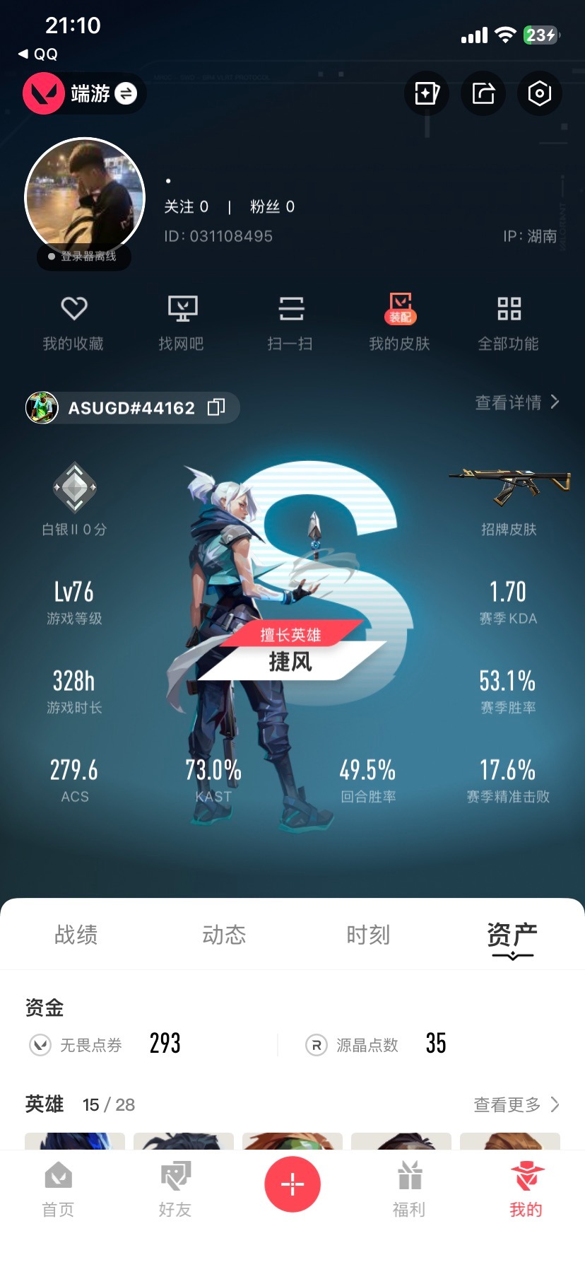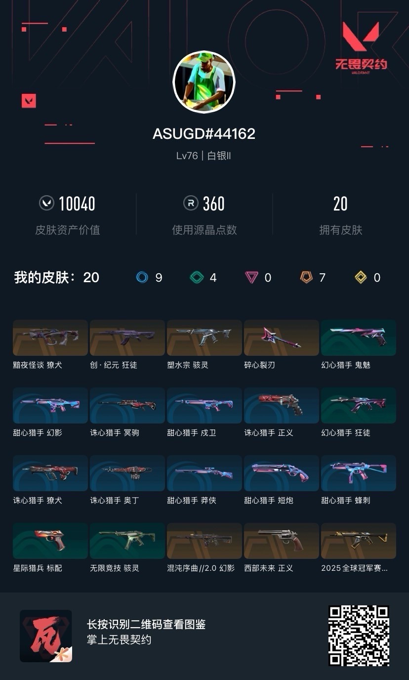 7橙皮 20皮肤 15英雄 50卡面 360已用源晶 白银段位 【近战武器皮肤】碎心裂刃 【佩呛皮肤】正义-西部未来 【冲锋呛皮肤】骇灵-塑水宗 【步呛皮肤】獠犬-黯夜怪谈狂徒-创·纪元幻影-混沌序曲2.02025全球冠军赛 狂徒