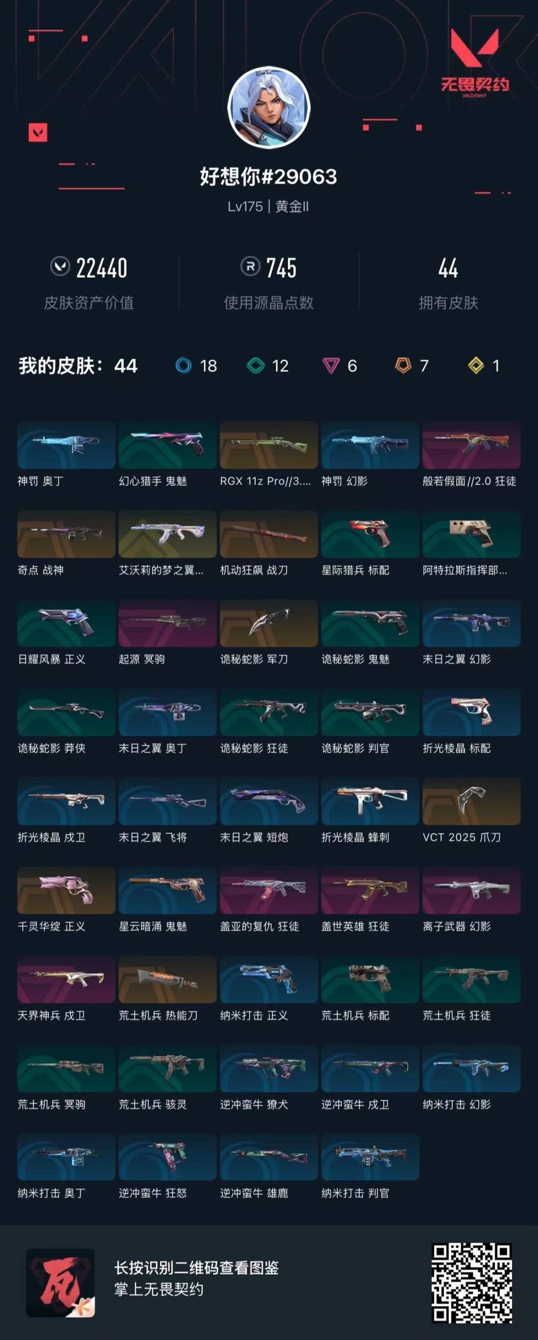 [16508629]7橙皮 1金皮 6紫皮 44皮肤 28英雄 90卡面 745已用源晶 黄金段位 【套装】vctcn2025套装vct 2025赛季礼包 【近战武器皮肤】诡秘蛇影vct 2025 爪刀荒土机兵热能刀机动狂飙战刀 【佩呛皮肤】正义-千灵华绽 【步呛皮肤】狂徒-般若假面//2.0狂徒-艾沃莉的梦之翼狂徒-盖亚的复仇狂徒-盖世英雄幻影-离子武器戍卫-天界神兵 【狙击呛皮肤】冥驹-起源莽侠-rgx 11z pro 3.0 【机呛皮肤】战神-奇点 【挂饰】袖珍捷风挂饰vct2025太平洋联赛挂饰vct2025美洲联赛挂饰vct2025emea联赛挂饰神中神挂饰vct2025cn联赛挂饰v26第一幕纪念币 挂饰双城之战小蛋糕挂饰迷你机甲挂饰