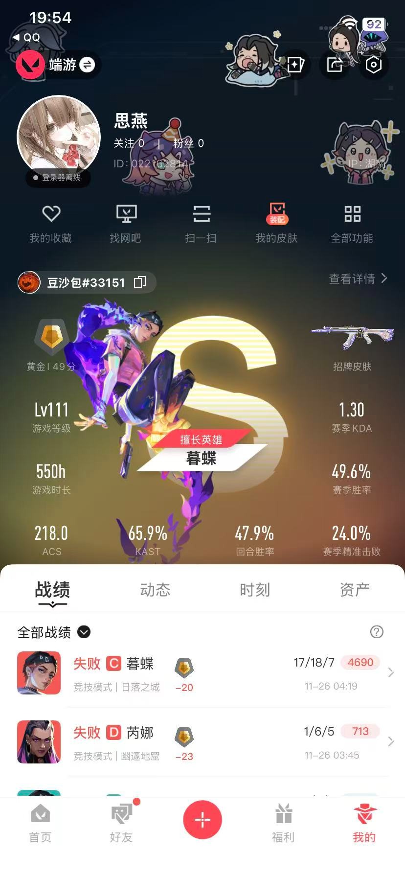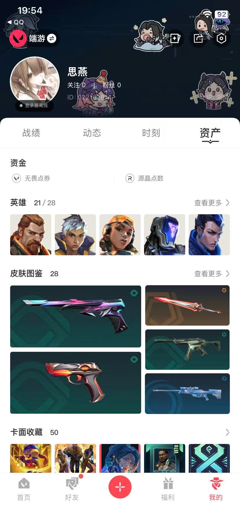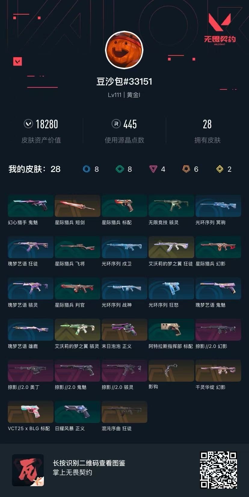 6橙皮 2金皮 4紫皮 28皮肤 21英雄 50卡面 445已用源晶 黄金段位 【套装】掠影2.0套装 【近战武器皮肤】星际猎兵 短剑影钩 【佩呛皮肤】标配-vct25xblg鬼魅-掠影2.0正义-末日泡泡 【冲锋呛皮肤】骇灵-掠影2.0骇灵-艾沃莉的梦之翼 【步呛皮肤】狂徒-混沌序曲幻