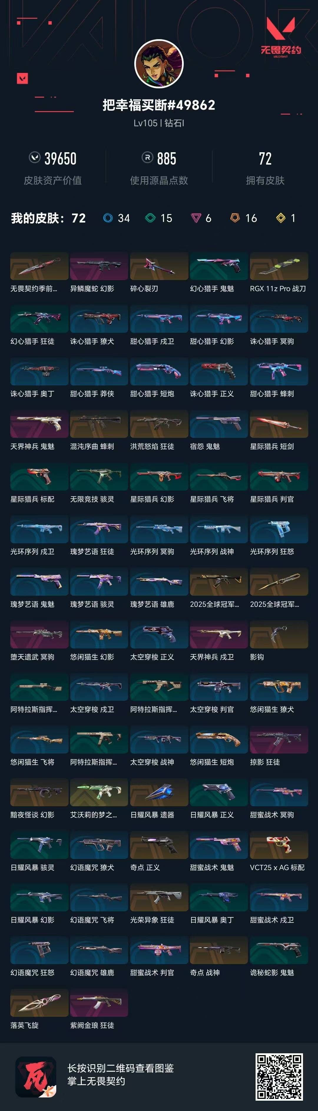 [16510665]16橙皮 1金皮 6紫皮 72皮肤 20英雄 98卡面 885已用源晶 钻石段位 【亮点皮肤】悲悯之刃 【套装】2025全球冠军赛 【近战武器皮肤】rgx 11z pro 战刀日耀风暴 遗器影钩星际猎兵 短剑2025全球冠军赛 蝴蝶刀碎心裂刃悲悯之刃落英飞旋 【佩呛皮肤】标配-vct25xag正义-奇点鬼魅-天界神兵 【冲锋呛皮肤】骇灵-艾沃莉的梦之翼蜂刺-混沌序曲 【步呛皮肤】幻影-异鳞魔蛇狂徒-掠影2025全球冠军赛 狂徒狂徒-光荣异象幻影-黯夜怪谈狂徒-紫阙金琅狂徒-洪荒怒焰戍卫-天界神兵 【狙击呛皮肤】冥驹-堕天遗武 【机呛皮肤】战神-奇点 【挂饰】神中神挂饰v25第六幕:超凡 挂饰2025全球冠军赛挂饰糖饼先生 挂饰v26第一幕纪念币 挂饰vctxag挂饰双城之战魄罗挂饰