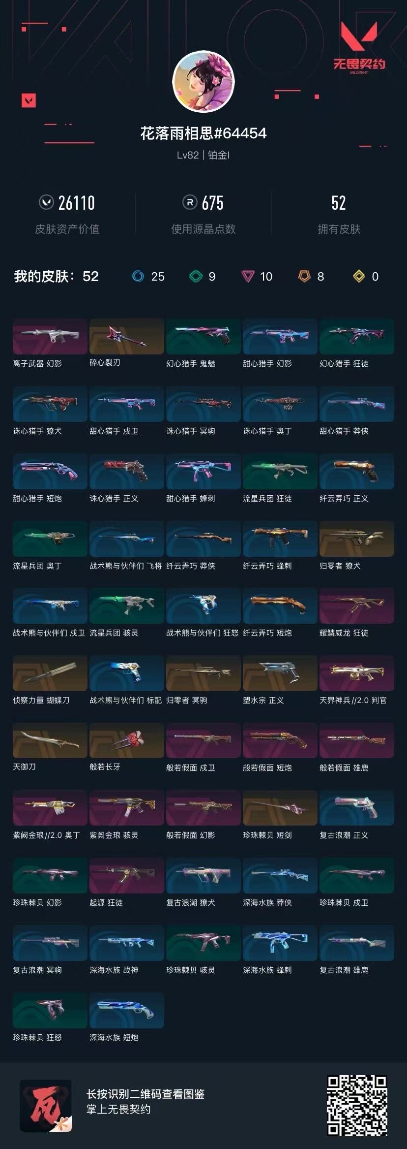[16511082]8橙皮 10紫皮 52皮肤 26英雄 76卡面 675已用源晶 铂金段位 【套装】般若假面套装 【近战武器皮肤】碎心裂刃天御刀蝴蝶刀-侦察力量短剑-珍珠棘贝般若长牙 【佩呛皮肤】正义-塑水宗短炮-般若假面 【冲锋呛皮肤】骇灵-紫阙金琅 【霰弹呛皮肤】雄鹿-般若假面判官-天界神兵2.0 【步呛皮肤】狂徒-耀鳞威龙狂徒-起源幻影-般若假面幻影-离子武器戍卫-般若假面獠犬-归零者 【狙击呛皮肤】冥驹-归零者 【机呛皮肤】奥丁-紫阙金琅2.0 【挂饰】袖珍捷风挂饰神中神挂饰传世莲华挂饰云开见日挂饰迷你机甲挂饰