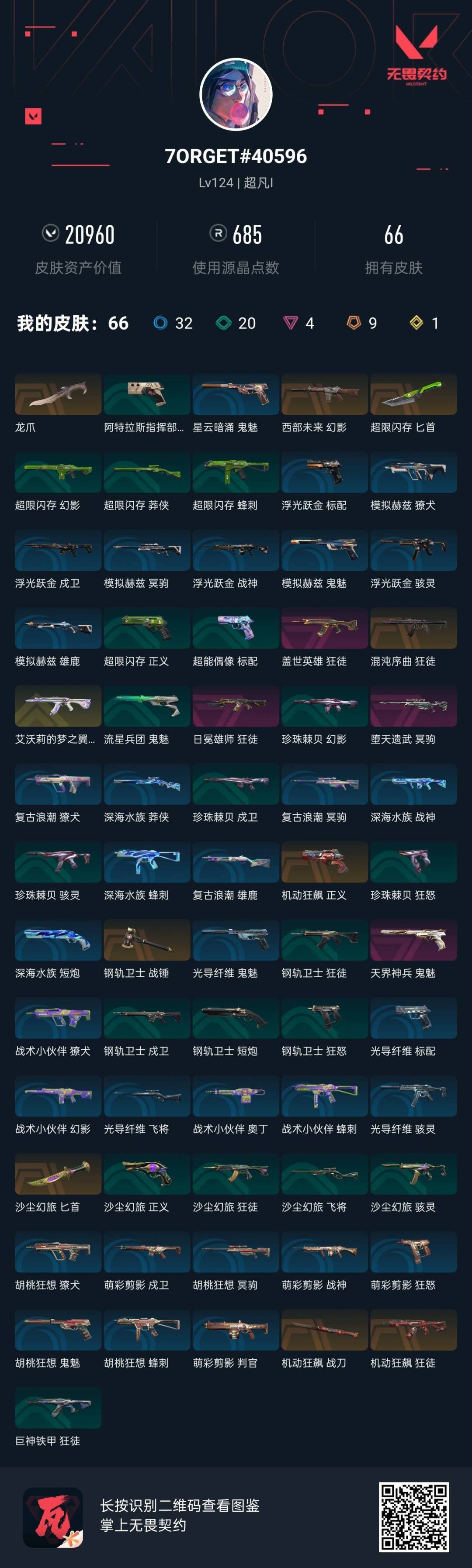 9橙皮 1金皮 4紫皮 66皮肤 27英雄 114卡面 685已用源晶 超凡段位 【近战武器皮肤】龙爪匕首-超限闪存战锤-钢轨卫士机动狂飙战刀匕首-沙尘幻旅 【佩呛皮肤】正义-机动狂飙鬼魅-天界神兵 【步呛皮肤】狂徒-混沌序曲幻影-西部未来狂徒-艾沃莉的梦之翼狂徒-机动狂飙狂徒-