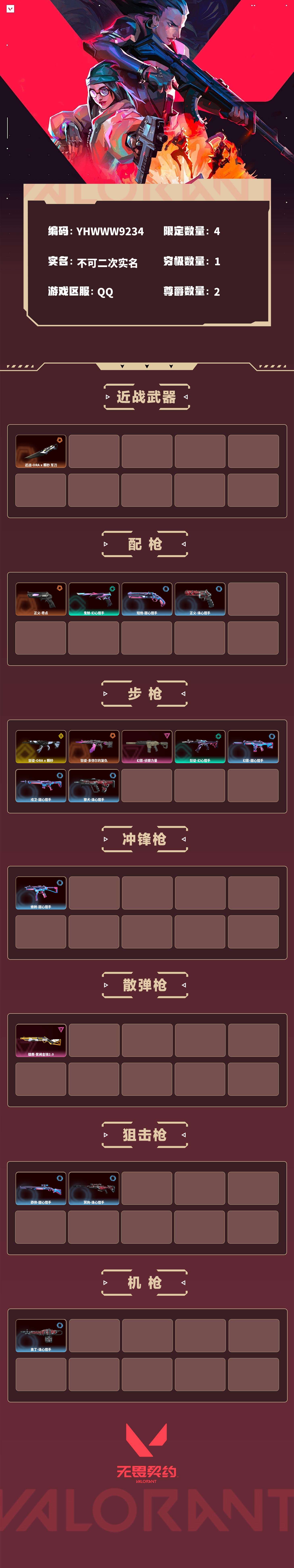 【无畏契约】【yhwww9234】等级:39,已用无畏点11130,已用源晶点270,橙皮:正义-奇点|狂徒-多弥尔的复仇|近战-a x 颗秒 军刀__紫皮:幻影-侦察力量|雄鹿-紫阙金琅2.0__段位:铂金__英雄:尚勃勒|维斯|黑梦|暮蝶|霓虹|幽影|夜露|炼狱|贤者|猎枭|芮娜|捷风|不死鸟|幻棱|雷兹|禁灭__蓝皮:蜂刺-甜心猎手|短炮-甜心猎手|莽侠-甜心猎手|幻影-甜心猎手|戍卫-甜心猎手|正义-诛心猎手|冥驹-诛心猎手|獠犬-诛心猎手|奥丁-诛心猎手__绿皮:狂徒-幻心猎手|鬼魅-幻心猎手__金皮:狂徒-a x 颗秒