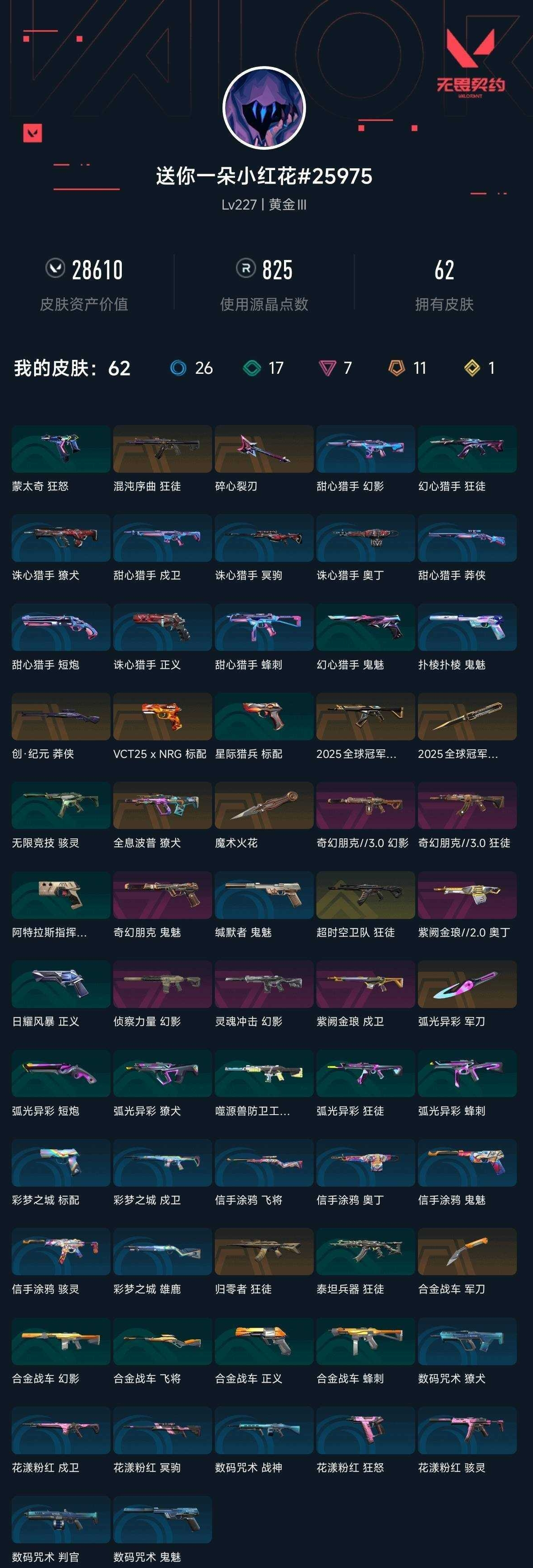 【无畏契约】【yhwww9237】等级:227,已用无畏点28610,已用源晶点825,橙皮:近战-弧光异彩 军刀|獠犬-全息波普|狂徒-归零者|狂徒-混沌序曲|近战-合金战车 军刀|莽侠-创·纪元|标配-vct25 x nrg|近战-魔术火花|狂徒-2025全球冠军赛|近战-2025全球冠军赛 蝴蝶刀__紫皮:奥丁-紫阙金琅2.0|鬼魅-奇幻朋克|幻影-灵魂冲击|幻影-侦察力量|戍卫-紫阙金琅|狂徒-奇幻朋克3.0|幻影-奇幻朋克3.0__段位:黄金__蓝皮:狂怒-花漾粉红|骇灵-花漾粉红|戍卫-花漾粉红|冥驹-花漾粉红|战神-数码咒术|獠犬-数码咒术|判官-数码咒术|鬼魅-数码咒术|鬼魅-缄默者|戍卫-彩梦之城|雄鹿-彩梦之城|标配-彩梦之城|鬼魅-扑棱扑棱|鬼魅-信手涂鸦|骇灵-信手涂鸦|奥丁-信手涂鸦|飞将-信手涂鸦|标配-阿特拉斯指挥部|蜂刺-甜心猎手|短炮-甜心猎手|莽侠-甜心猎手|幻影-甜心猎手|戍卫-甜心猎手|正义-诛心猎手|冥驹-诛心猎手|獠犬-诛心猎手|奥丁-诛心猎手__绿皮:蜂刺-合金战车|正义-合金战车|幻影-合金战车|飞将-合金战车|骇灵-无限竞技|短炮-弧光异彩|獠犬-弧光异彩|蜂刺-弧光异彩|狂徒-弧光异彩|幻影-噬源兽防卫工程|狂徒-泰坦兵器|正义-日耀风暴|标配-星际猎兵|狂徒-幻心猎手|鬼魅-幻心猎手|狂怒-蒙太奇__金皮:狂徒-超时空卫队__英雄:尚勃勒|维斯|黑梦|斯凯|暮蝶|盖可|霓虹|壹决|星礈|k/o|幽影|夜露|钢锁|海神|奇乐|炼狱|铁臂|贤者|猎枭|钛狐|芮娜|零|捷风|蝰蛇|不死鸟|幻棱|雷兹|禁灭