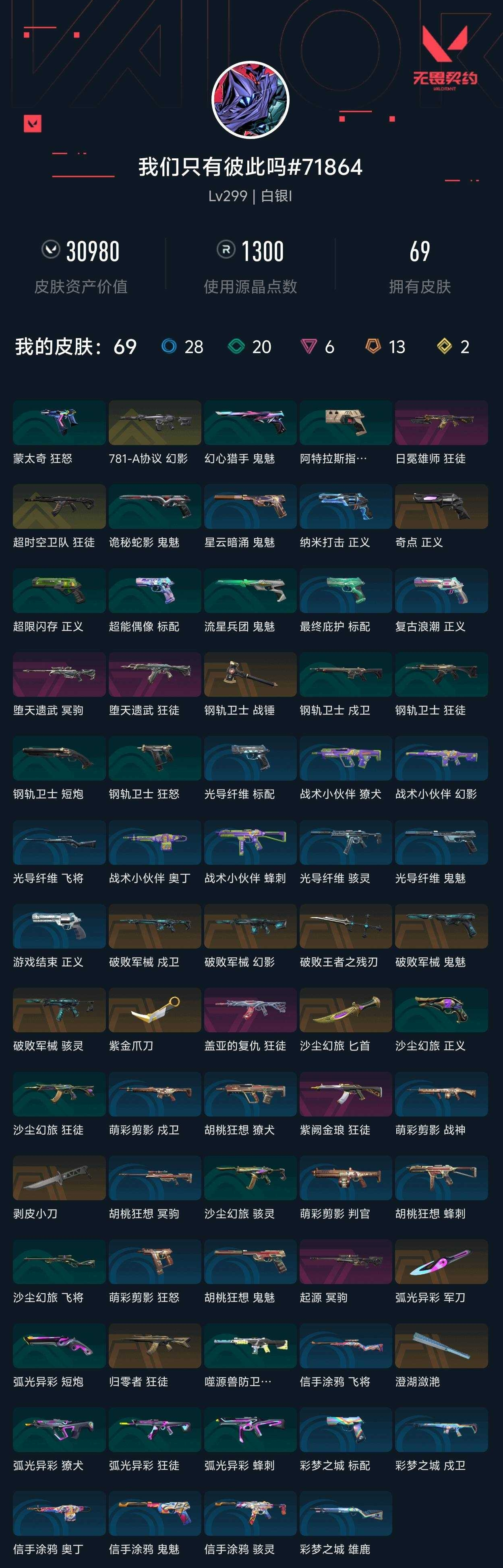 【无畏契约】【yhwww9220】等级:299,已用无畏点30980,已用源晶点1300,金皮:幻影-781-a协议|狂徒-超时空卫队__橙皮:骇灵-破败军械|鬼魅-破败军械|幻影-破败军械|近战-剥皮小刀|近战-弧光异彩 军刀|近战-钢轨卫士 战锤|近战-澄湖潋滟|近战-破败王者之残刃|近战-沙尘幻旅 匕首|近战-紫金爪刀|狂徒-归零者|正义-奇点|戍卫-破败军械__紫皮:狂徒-日冕雄师|狂徒-盖亚的复仇|狂徒-堕天遗武|冥驹-堕天遗武|冥驹-起源|狂徒-紫阙金琅__绿皮:短炮-钢轨卫士|狂怒-钢轨卫士|狂徒-钢轨卫士|戍卫-钢轨卫士|标配-超能偶像|正义-超限闪存|短炮-弧光异彩|獠犬-弧光异彩|蜂刺-弧光异彩|狂徒-弧光异彩|鬼魅-流星兵团|正义-沙尘幻旅|狂徒-沙尘幻旅|飞将-沙尘幻旅|骇灵-沙尘幻旅|幻影-噬源兽防卫工程|鬼魅-诡秘蛇影|鬼魅-幻心猎手|狂怒-蒙太奇__蓝皮:鬼魅-光导纤维|飞将-光导纤维|标配-光导纤维|骇灵-光导纤维|正义-复古浪潮|标配-最终庇护|正义-游戏结束|正义-纳米打击|鬼魅-星云暗涌|戍卫-彩梦之城|雄鹿-彩梦之城|标配-彩梦之城|鬼魅-胡桃狂想|獠犬-胡桃狂想|蜂刺-胡桃狂想|冥驹-胡桃狂想|戍卫-萌彩剪影|战神-萌彩剪影|狂怒-萌彩剪影|判官-萌彩剪影|鬼魅-信手涂鸦|骇灵-信手涂鸦|奥丁-信手涂鸦|飞将-信手涂鸦|蜂刺-战术小伙伴|幻影-战术小伙伴|獠犬-战术小伙伴|奥丁-战术小伙伴|标配-阿特拉斯指挥部__段位:白银__英雄:尚勃勒|维斯|黑梦|斯凯|暮蝶|盖可|霓虹|壹决|星礈|k/o|幽影|夜露|钢锁|海神|奇乐|炼狱|铁臂|贤者|猎枭|钛狐|芮娜|零|捷风|蝰蛇|不死鸟|幻棱|雷兹|禁灭
