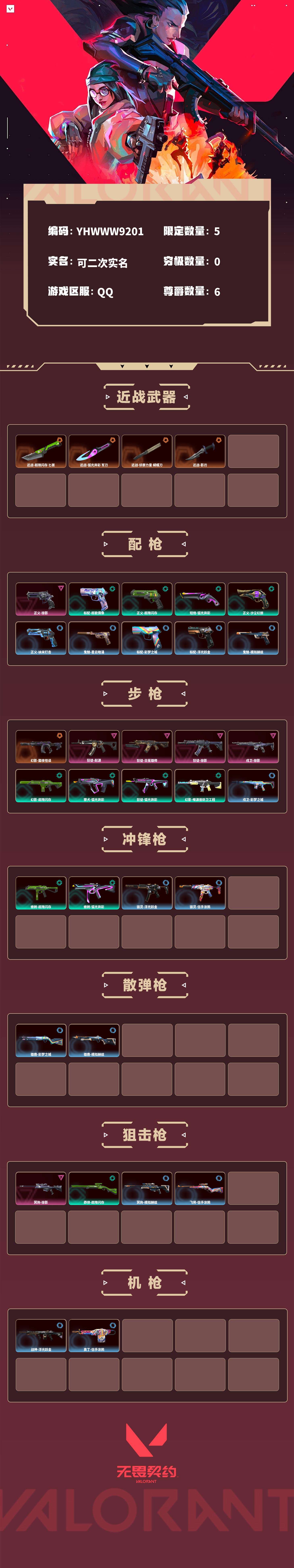 【无畏契约】【yhwww9201】等级:146,已用无畏点14490,已用源晶点460,橙皮:幻影-黯夜怪谈|近战-超限闪存 匕首|近战-弧光异彩 军刀|近战-侦察力量 蝴蝶刀|近战-影刃__紫皮:狂徒-起源|狂徒-日冕雄师|冥驹-掠影|狂徒-掠影|戍卫-掠影|正义-掠影__段位:未定级__蓝皮:正义-纳米打击|鬼魅-星云暗涌|戍卫-彩梦之城|雄鹿-彩梦之城|标配-彩梦之城|骇灵-浮光跃金|标配-浮光跃金|戍卫-浮光跃金|战神-浮光跃金|鬼魅-模拟赫兹|獠犬-模拟赫兹|冥驹-模拟赫兹|雄鹿-模拟赫兹|鬼魅-信手涂鸦|骇灵-信手涂鸦|奥丁-信手涂鸦|飞将-信手涂鸦__绿皮:标配-超能偶像|正义-超限闪存|莽侠-超限闪存|幻影-超限闪存|蜂刺-超限闪存|短炮-弧光异彩|獠犬-弧光异彩|蜂刺-弧光异彩|狂徒-弧光异彩|正义-沙尘幻旅|幻影-噬源兽防卫工程__英雄:尚勃勒|维斯|黑梦|斯凯|暮蝶|盖可|霓虹|壹决|星礈|k/o|幽影|夜露|钢锁|海神|奇乐|炼狱|铁臂|贤者|猎枭|钛狐|芮娜|零|捷风|蝰蛇|不死鸟|幻棱|雷兹