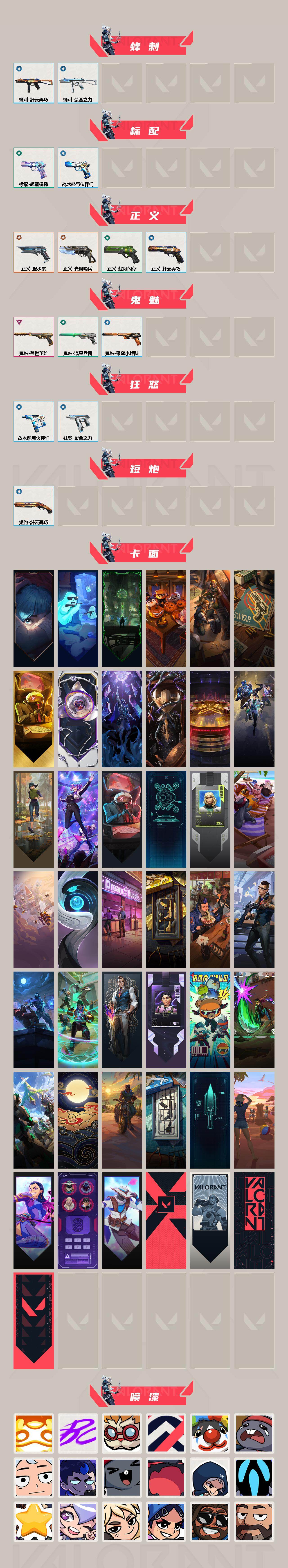 【英雄】:幻棱,炼狱,维斯,暮蝶,钛狐,壹决,铁臂,捷风,雷兹,幽影,不死鸟,贤者,猎枭,蝰蛇,零,芮娜,奇乐,尚勃勒,霓虹,斯凯,夜露,星礈,k/o,海神,盖可,黑梦,钢锁 【近战武器】:近战武器-流星兵团 短剑,近战武器-超能偶像 应援棒 【狂徒】:狂徒-塑水宗,狂徒-日冕雄师,狂徒-超能偶像,狂徒-流星兵团 【幻影】:幻影-聚合之力 【戍卫】:戍卫-超能偶像,戍卫-战术熊与伙伴们 【獠犬