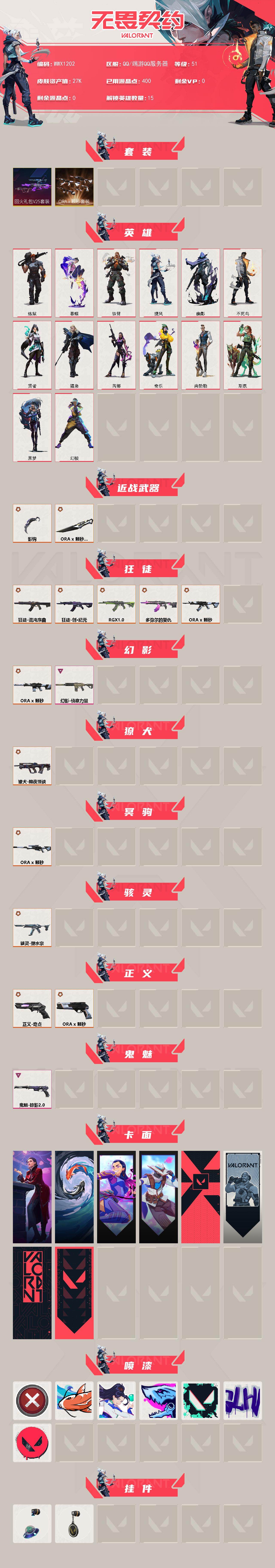 【wwx1202】终极10/传奇4/卓越2/皮肤35/等级51/段位:白银/回火礼包// v25套装/a x 颗秒套装/幻棱/炼狱/暮蝶/铁臂/捷风/幽影/不死鸟/贤者/猎枭/芮娜/奇乐/尚勃勒/斯凯/黑梦/近战武器-a x 颗秒 军刀/近战武器-影钩/混沌序曲-狂徒/创·纪元-狂徒/狂徒-rgx 11z pro/狂徒-多弥尔的复仇/狂徒-a x 颗秒/幻影-a x