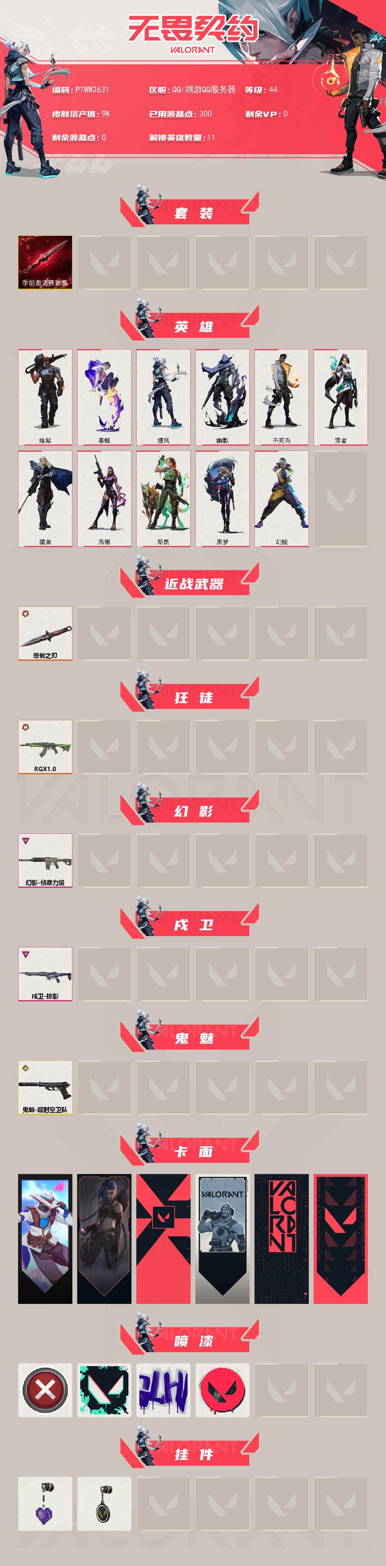 【套装】:无畏契约季前邀请赛套装 【英雄】:幻棱,炼狱,暮蝶,捷风,幽影,不死鸟,贤者,猎枭,芮娜,斯凯,黑梦 【近战武器】:近战武器-无畏契约季前邀请赛 悲悯之刃 【狂徒】:狂徒-rgx 11z pro 【幻影】:幻影-侦察力量 【戍卫】:戍卫-掠影 【鬼魅】:鬼魅-超时空卫队 【卡面】:无畏契约go!第一卷:零 卡面,《双城之战》金克丝 卡面,代号红色 卡面,新兵报到 卡面,v契约 卡面,