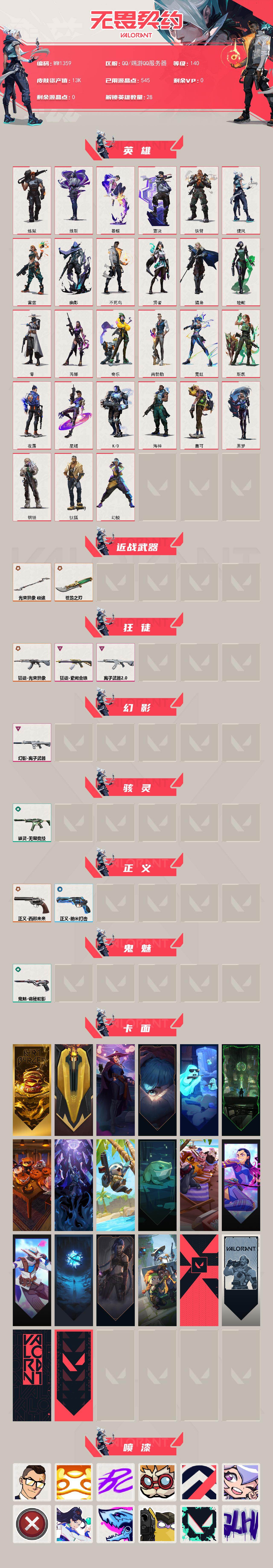 【ww1359】终极4/卓越3/皮肤13/等级140/段位:黄金/幻棱/炼狱/维斯/暮蝶/钛狐/壹决/铁臂/捷风/雷兹/幽影/不死鸟/贤者/猎枭/蝰蛇/零/芮娜/奇乐/尚勃勒/霓虹/斯凯/夜露/星礈/k/o/海神/盖可/黑梦/钢锁/近战武器-5周年//公测重制版 苍龙之刃/近战武器-光荣异象 歧途/狂徒-光荣异象/狂徒-紫阙金琅/狂徒-离子武器//2.0/幻影-离子武器/骇灵-无限竞技/正义-西部未来/正义-纳米打击/鬼魅-诡秘蛇影/终章:激斗汉堡 卡面/进入射程 卡面/银弹猎手 卡面/《双城之战》拥抱 卡面/精灵大战 卡面/欢迎来到底城 卡面/南瓜盛典 卡面/失而复得 卡面/树懒大作战 卡面/霓帧牛蛙 卡面/战术小伙伴的夏日 卡面/无畏契约go!第一卷:芮娜 卡面/无畏契约go!第一卷:零 卡面/无垠星环 卡面/《双城之战》金克丝 卡面/别冒尖 卡面/代号红色 卡面/新兵报到 卡面/v契约 卡面/无畏契约 卡面/小小心意 喷漆/嗨宝南瓜灯 喷漆/嘭! 喷漆/都算到了 喷漆/控场勿近 喷漆/超能偶像 喷漆/买装还是存钱 喷漆/无畏契约go!第一卷:贤者 喷漆/暴走萝莉 喷漆/放下武器 喷漆/胜利属于无畏契约 喷漆/glhf 喷漆/无畏契约 喷漆/终章:猫猫木乃伊 挂饰/悠闲鸡块 挂饰/伞绳 挂饰/《双城之战》小蛋糕 挂饰/第九季//第三幕 纪念币 挂饰/无畏契约go!第一卷 零 挂饰/动力机箱 挂饰/天外飞客 挂饰/《双城之战》魄罗 挂饰/无畏契约 纪念币 挂饰