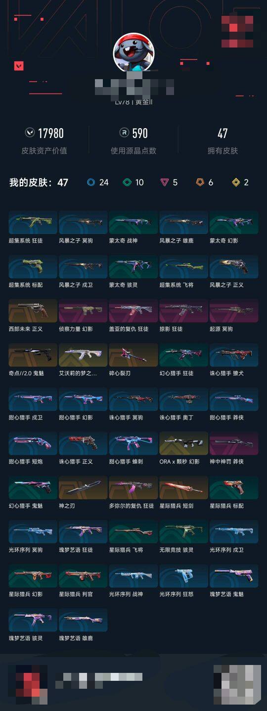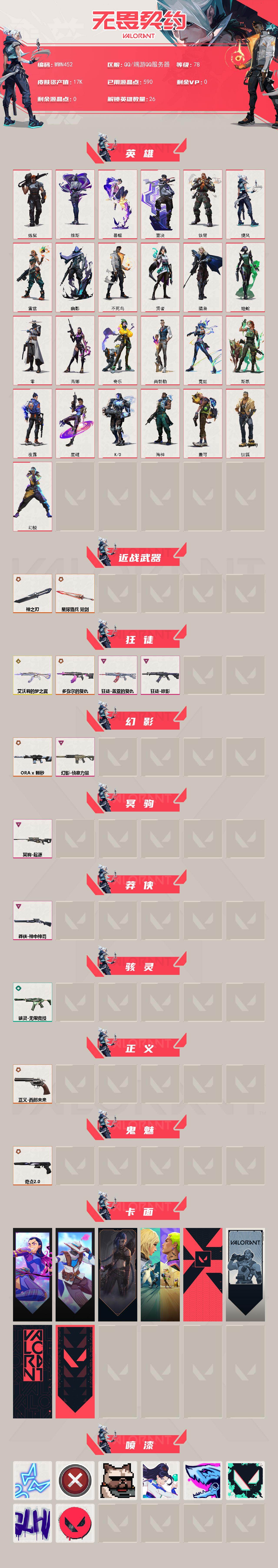 【wwn452】终极6/传奇2/卓越5/皮肤47/等级78/段位:黄金/幻棱/炼狱/维斯/暮蝶/钛狐/壹决/铁臂/捷风/雷兹/幽影/不死鸟/贤者/猎枭/蝰蛇/零/芮娜/奇乐/尚勃勒/霓虹/斯凯/夜露/星礈/k/o/海神/盖可/近战武器-神之刃/近战武器-星际猎兵 短剑/狂徒-艾沃莉的梦之翼/狂徒-多弥尔的复仇/狂徒-掠影/狂徒-盖亚的复仇/幻影-a x 颗秒/幻影-侦察力量/冥驹-起源/莽侠-神中神罚/骇灵-无限竞技/正义-西部未来/鬼魅-奇点//2.0/无畏契约go!第一卷:芮娜 卡面/无畏契约go!第一卷:零 卡面/《双城之战》金克丝 卡面/钢锁vs盖可 卡面/代号红色 卡面/新兵报到 卡面/v契约 卡面/无畏契约 卡面/霓光四射 喷漆/买装还是存钱 喷漆/关门放狗 喷漆/无畏契约go!第一卷:贤者 喷漆/暴走萝莉 喷漆/胜利属于无畏契约 喷漆/glhf 喷漆/无畏契约 喷漆/无畏契约go!第一卷 零 挂饰/天外飞客 挂饰/无畏契约 纪念币 挂饰