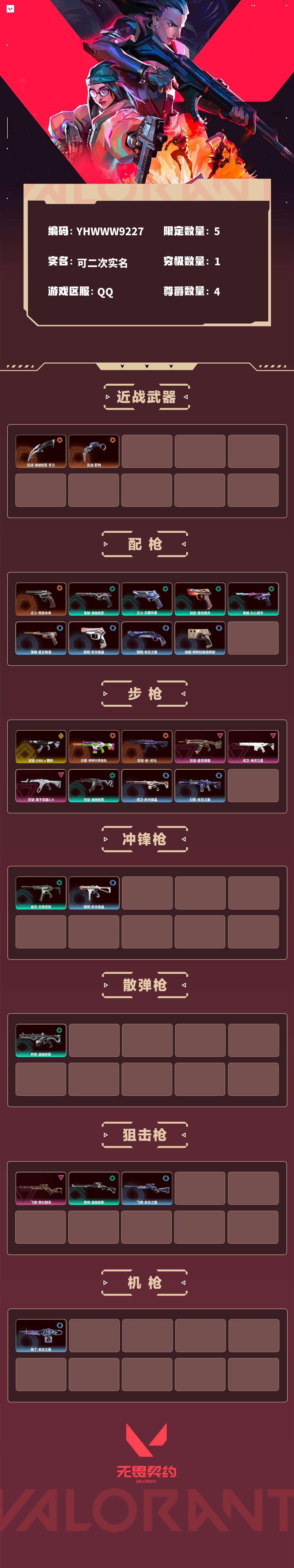 【无畏契约】【yhwww9227】等级:145,已用无畏点15000,已用源晶点610,橙皮:幻影-砰砰x特攻队|狂徒-创·纪元|正义-西部未来|近战-诡秘蛇影 军刀|近战-影钩__紫皮:飞将-奇幻朋克|狂徒-盖世英雄|戍卫-海洋之星|狂徒-离子武器2.0__段位:铂金__绿皮:骇灵-无限竞技|判官-诡秘蛇影|鬼魅-诡秘蛇影|莽侠-诡秘蛇影|狂徒-诡秘蛇影|正义-日耀风暴|标配-星际猎兵|鬼魅-幻心猎手__蓝皮:鬼魅-星云暗涌|蜂刺-折光棱晶|戍卫-折光棱晶|标配-折光棱晶|飞将-末日之翼|幻影-末日之翼|短炮-末日之翼|奥丁-末日之翼|标配-阿特拉斯指挥部__英雄:尚勃勒|维斯|黑梦|斯凯|暮蝶|盖可|霓虹|壹决|星礈|k/o|幽影|夜露|钢锁|海神|奇乐|炼狱|铁臂|贤者|猎枭|钛狐|芮娜|零|捷风|蝰蛇|不死鸟|幻棱|雷兹|禁灭__金皮:狂徒-a x 颗秒