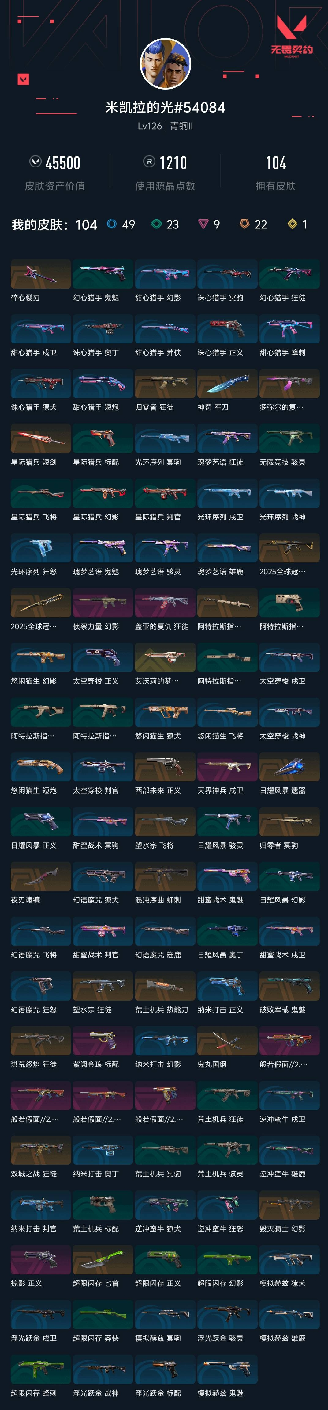 【无畏契约】【yhwww9218】等级:126,已用无畏点45500,已用源晶点1210,金皮:奥丁-艾沃莉的梦之翼__橙皮:蜂刺-混沌序曲|飞将-塑水宗|鬼魅-破败军械|近战-超限闪存 匕首|近战-神罚 军刀|近战-夜刃诡镰|狂徒-归零者|狂徒-塑水宗|狂徒-洪荒怒焰|冥驹-归零者|近战-荒土机兵 热能刀|幻影-毁灭骑士|狂徒-双城之战|近战-鬼丸国纲|正义-西部未来|近战-日耀风暴 遗器|近战-阿特拉斯指挥部 甩棍|近战-星际猎兵 短剑|狂徒-2025全球冠军赛|近战-2025全球冠军赛 蝴蝶刀|狂徒-多弥尔的复仇__紫皮:标配-紫阙金琅|幻影-侦察力量|狂徒-盖亚的复仇|戍卫-天界神兵|正义-掠影|战神-般若假面2.0|獠犬-般若假面2.0|狂徒-般若假面2.0|狂怒-般若假面2.0__段位:青铜__绿皮:骇灵-无限竞技|狂徒-荒土机兵|标配-荒土机兵|骇灵-荒土机兵|冥驹-荒土机兵|正义-超限闪存|莽侠-超限闪存|幻影-超限闪存|蜂刺-超限闪存|正义-日耀风暴|幻影-日耀风暴|奥丁-日耀风暴|短炮-悠闲猫生|飞将-悠闲猫生|幻影-悠闲猫生|獠犬-悠闲猫生|判官-星际猎兵|飞将-星际猎兵|标配-星际猎兵|狂徒-幻心猎手|鬼魅-幻心猎手__蓝皮:判官-纳米打击|正义-纳米打击|奥丁-纳米打击|幻影-纳米打击|雄鹿-逆冲蛮牛|狂怒-逆冲蛮牛|戍卫-逆冲蛮牛|獠犬-逆冲蛮牛|骇灵-浮光跃金|标配-浮光跃金|戍卫-浮光跃金|战神-浮光跃金|鬼魅-模拟赫兹|獠犬-模拟赫兹|冥驹-模拟赫兹|雄鹿-模拟赫兹|鬼魅-甜蜜战术|判官-甜蜜战术|戍卫-甜蜜战术|雄鹿-幻语魔咒|獠犬-幻语魔咒|飞将-幻语魔咒|狂怒-幻语魔咒|正义-太空穿梭|战神-太空穿梭|判官-太空穿梭|戍卫-太空穿梭|骇灵-阿特拉斯指挥部|莽侠-阿特拉斯指挥部|标配-阿特拉斯指挥部|狂徒-阿特拉斯指挥部|狂怒-光环序列|戍卫-光环序列|冥驹-光环序列|战神-光环序列|狂徒-瑰梦艺语|鬼魅-瑰梦艺语|骇灵-瑰梦艺语|雄鹿-瑰梦艺语|蜂刺-甜心猎手|短炮-甜心猎手|莽侠-甜心猎手|幻影-甜心猎手|戍卫-甜心猎手|正义-诛心猎手|冥驹-诛心猎手|獠犬-诛心猎手|奥丁-诛心猎手__英雄:尚勃勒|维斯|黑梦|斯凯|暮蝶|盖可|霓虹|壹决|k/o|幽影|夜露|钢锁|海神|奇乐|炼狱|铁臂|贤者|猎枭|芮娜|零|捷风|蝰蛇|不死鸟|幻棱|雷兹|禁灭