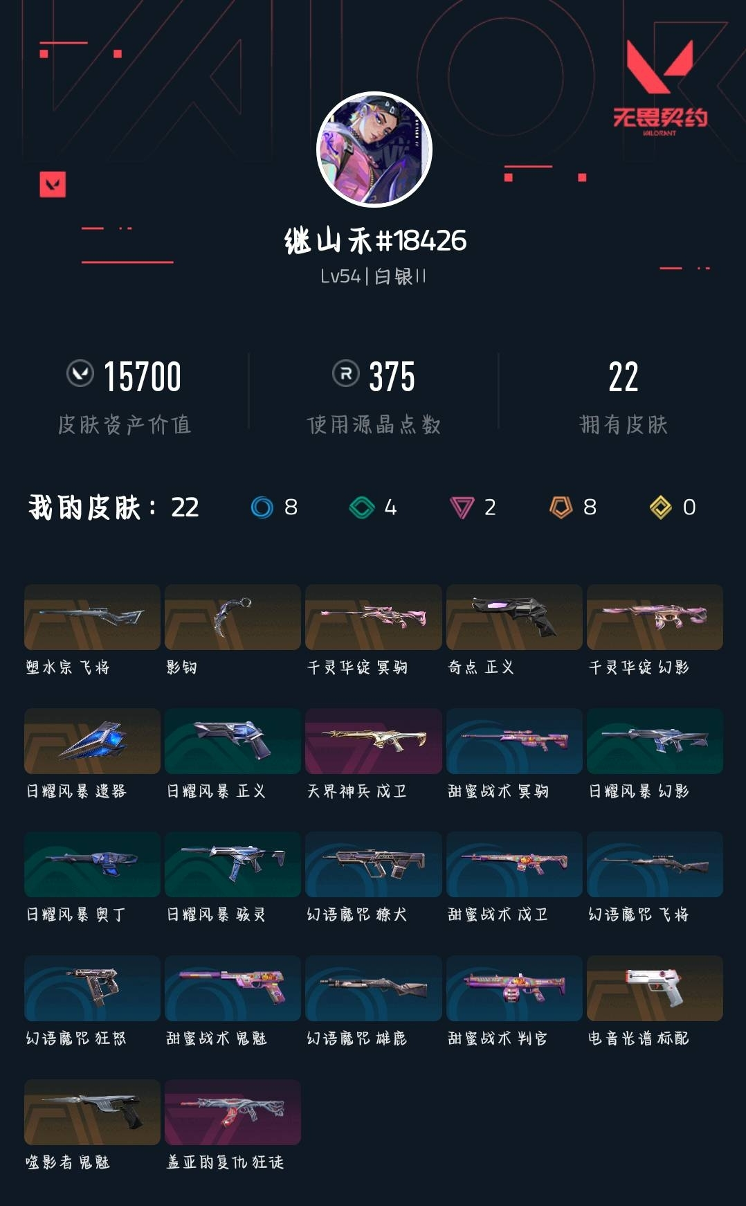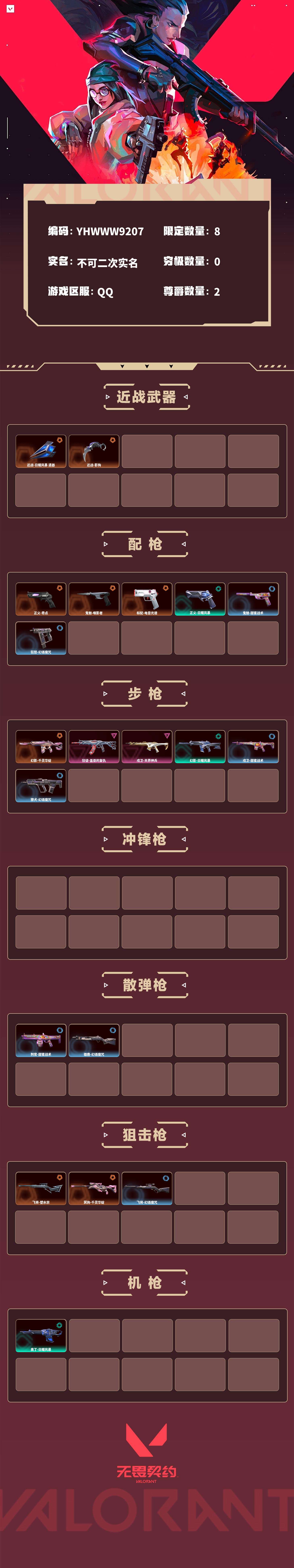 【无畏契约】【yhwww9207】等级:54,已用无畏点15700,已用源晶点375,橙皮:飞将-塑水宗|幻影-千灵华绽|冥驹-千灵华绽|正义-奇点|鬼魅-噬影者|标配-电音光谱|近战-日耀风暴 遗器|近战-影钩__紫皮:狂徒-盖亚的复仇|戍卫-天界神兵__段位:白银__绿皮:正义-日耀风暴|幻影-日耀风暴|奥丁-日耀风暴__蓝皮:鬼魅-甜蜜战术|判官-甜蜜战术|戍卫-甜蜜战术|雄鹿-幻语魔咒|獠犬-幻语魔咒|飞将-幻语魔咒|狂怒-幻语魔咒__英雄:黑梦|暮蝶|霓虹|幽影|炼狱|铁臂|贤者|猎枭|芮娜|捷风|不死鸟|幻棱|雷兹|禁灭