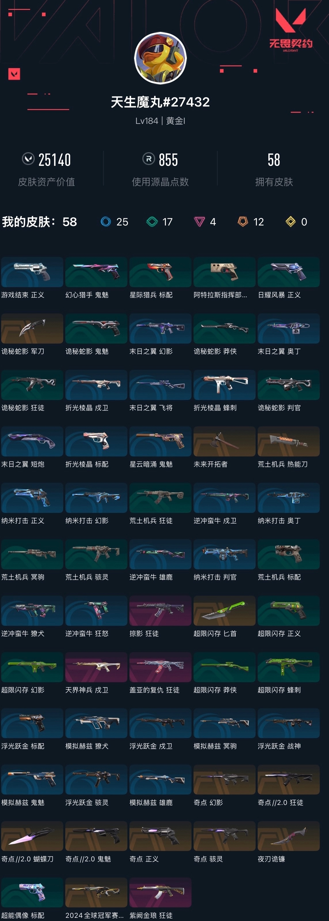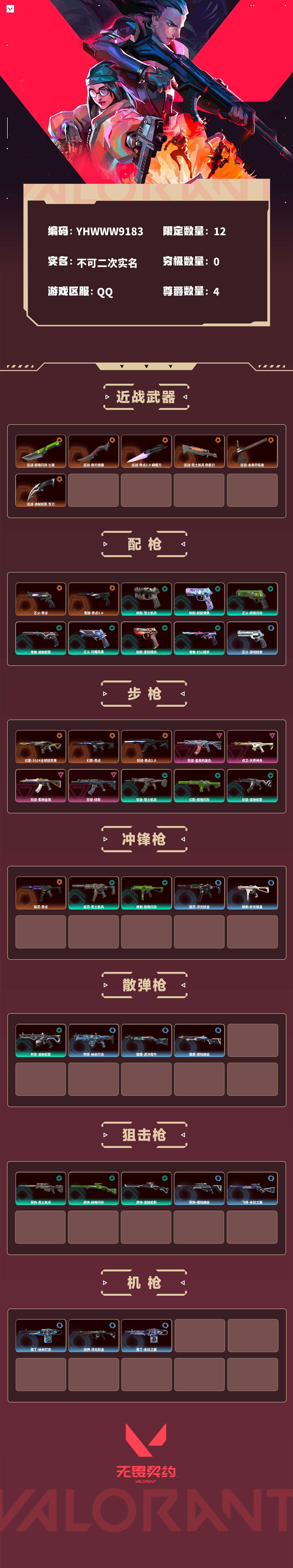 【无畏契约】【yhwww9183】等级:184,已用无畏点25140,已用源晶点855,橙皮:骇灵-奇点|幻影-2024全球冠军赛|幻影-奇点|近战-超限闪存 匕首|近战-夜刃诡镰|正义-奇点|狂徒-奇点2.0|鬼魅-奇点2.0|近战-奇点2.0 蝴蝶刀|近战-荒土机兵 热能刀|近战-未来开拓者|近战-诡秘蛇影 军刀__紫皮:狂徒-盖亚的复仇|戍卫-天界神兵|狂徒-紫阙金琅|狂徒-掠影__段位:黄金__蓝皮:正义-游戏结束|判官-纳米打击|正义-纳米打击|奥丁-纳米打击|幻影-纳米打击|雄鹿-逆冲蛮牛|狂怒-逆冲蛮牛|戍卫-逆冲蛮牛|獠犬-逆冲蛮牛|鬼魅-星云暗涌|骇灵-浮光跃金|标配-浮光跃金|戍卫-浮光跃金|战神-浮光跃金|鬼魅-模拟赫兹|獠犬-模拟赫兹|冥驹-模拟赫兹|雄鹿-模拟赫兹|蜂刺-折光棱晶|戍卫-折光棱晶|标配-折光棱晶|飞将-末日之翼|幻影-末日之翼|短炮-末日之翼|奥丁-末日之翼|标配-阿特拉斯指挥部__绿皮:狂徒-荒土机兵|标配-荒土机兵|骇灵-荒土机兵|冥驹-荒土机兵|标配-超能偶像|正义-超限闪存|莽侠-超限闪存|幻影-超限闪存|蜂刺-超限闪存|判官-诡秘蛇影|鬼魅-诡秘蛇影|莽侠-诡秘蛇影|狂徒-诡秘蛇影|正义-日耀风暴|标配-星际猎兵|鬼魅-幻心猎手__英雄:尚勃勒|维斯|黑梦|斯凯|暮蝶|盖可|霓虹|壹决|星礈|k/o|幽影|夜露|钢锁|海神|奇乐|炼狱|铁臂|贤者|猎枭|钛狐|芮娜|零|捷风|蝰蛇|不死鸟|幻棱|雷兹|禁灭