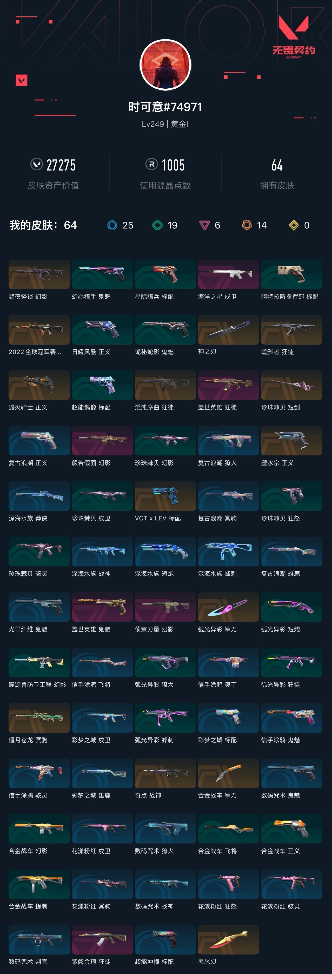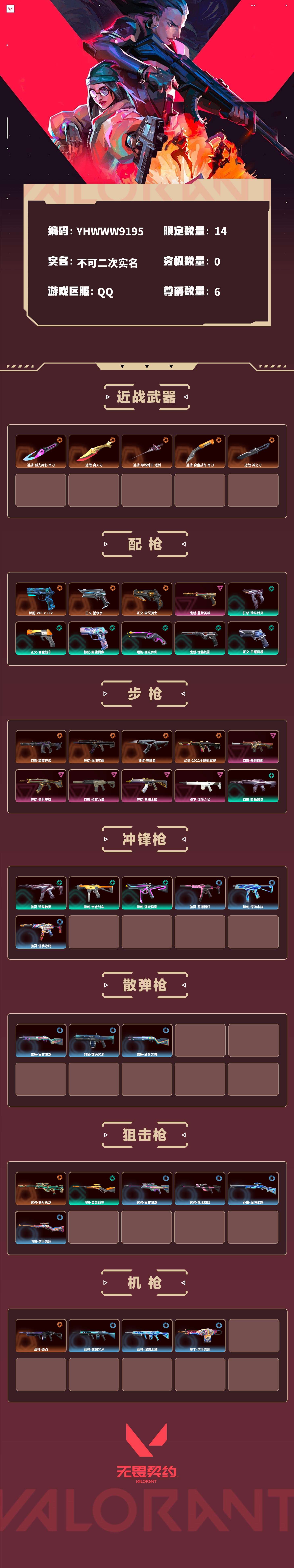 【无畏契约】【yhwww9195】等级:249,已用无畏点27275,已用源晶点1005,橙皮:标配-vct x lev|幻影-黯夜怪谈|近战-弧光异彩 军刀|近战-离火刃|近战-珍珠棘贝 短剑|狂徒-混沌序曲|正义-塑水宗|战神-奇点|冥驹-偃月苍龙|近战-合金战车 军刀|正义-毁灭骑士|狂徒-噬影者|近战-神之刃|幻影-2022全球冠军赛__紫皮:鬼魅-盖世英雄|幻影-般若假面|狂徒-盖世英雄|幻影-侦察力量|狂徒-紫阙金琅|戍卫-海洋之星__绿皮:骇灵-珍珠棘贝|幻影-珍珠棘贝|狂怒-珍珠棘贝|戍卫-珍珠棘贝|蜂刺-合金战车|正义-合金战车|幻影-合金战车|飞将-合金战车|标配-超能偶像|短炮-弧光异彩|獠犬-弧光异彩|蜂刺-弧光异彩|狂徒-弧光异彩|幻影-噬源兽防卫工程|鬼魅-诡秘蛇影|正义-日耀风暴|标配-星际猎兵|鬼魅-幻心猎手__蓝皮:鬼魅-光导纤维|獠犬-复古浪潮|冥驹-复古浪潮|雄鹿-复古浪潮|正义-复古浪潮|标配-超能冲撞|狂怒-花漾粉红|骇灵-花漾粉红|戍卫-花漾粉红|冥驹-花漾粉红|战神-数码咒术|獠犬-数码咒术|判官-数码咒术|鬼魅-数码咒术|戍卫-彩梦之城|雄鹿-彩梦之城|标配-彩梦之城|战神-深海水族|短炮-深海水族|蜂刺-深海水族|莽侠-深海水族|鬼魅-信手涂鸦|骇灵-信手涂鸦|奥丁-信手涂鸦|飞将-信手涂鸦|标配-阿特拉斯指挥部__段位:黄金__英雄:尚勃勒|维斯|黑梦|斯凯|暮蝶|盖可|霓虹|壹决|星礈|k/o|幽影|夜露|钢锁|海神|奇乐|炼狱|铁臂|贤者|猎枭|钛狐|芮娜|零|捷风|蝰蛇|不死鸟|幻棱|雷兹|禁灭