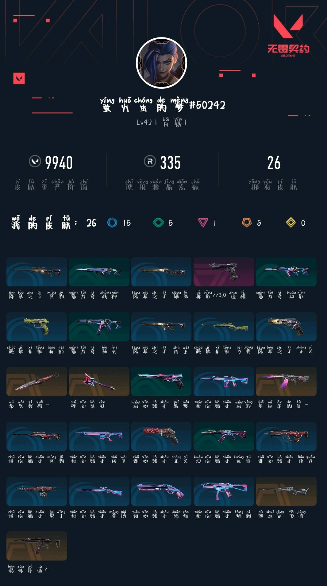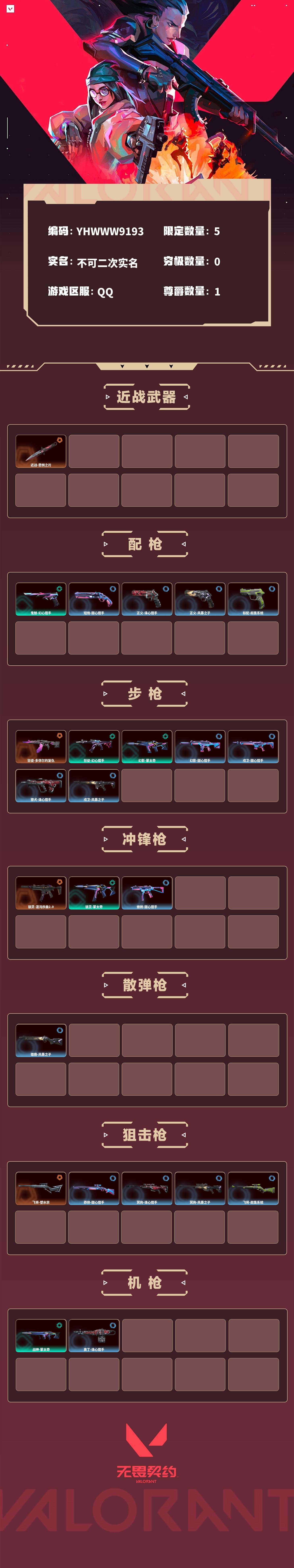 【无畏契约】【yhwww9193】等级:42,已用无畏点9940,已用源晶点335,橙皮:飞将-塑水宗|骇灵-混沌序曲2.0|狂徒-多弥尔的复仇|近战-悲悯之刃__段位:白银__英雄:尚勃勒|黑梦|斯凯|壹决|k/o|幽影|夜露|钢锁|炼狱|贤者|猎枭|芮娜|捷风|不死鸟|禁灭__蓝皮:蜂刺-甜心猎手|短炮-甜心猎手|莽侠-甜心猎手|幻影-甜心猎手|戍卫-甜心猎手|正义-诛心猎手|冥驹-诛心猎手|獠犬-诛心猎手|奥丁-诛心猎手|雄鹿-风暴之子|戍卫-风暴之子|正义-风暴之子|冥驹-风暴之子|标配-超集系统|飞将-超集系统__绿皮:狂徒-幻心猎手|鬼魅-幻心猎手|战神-蒙太奇|幻影-蒙太奇|骇灵-蒙太奇__紫皮:追猎-掠影3.0