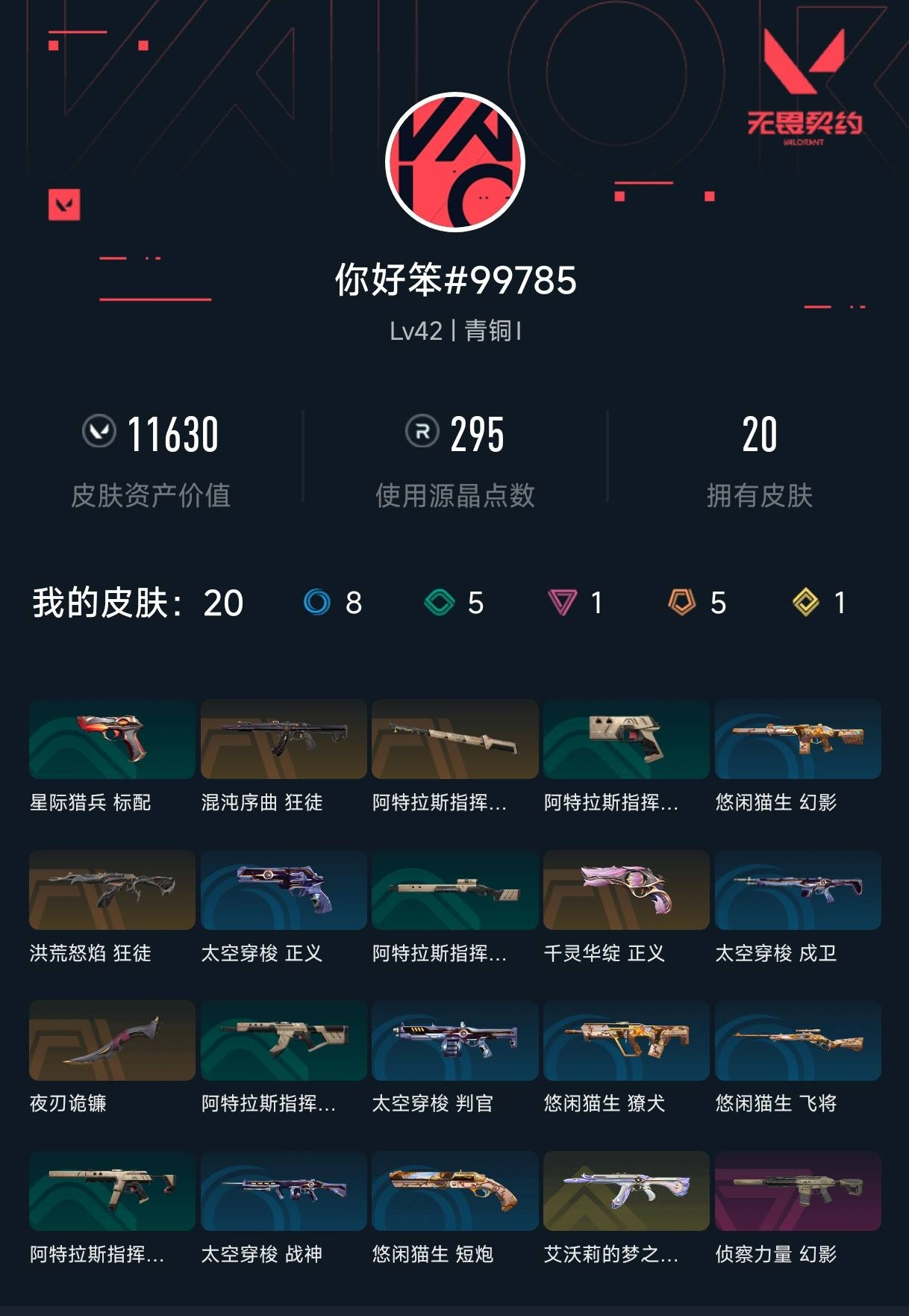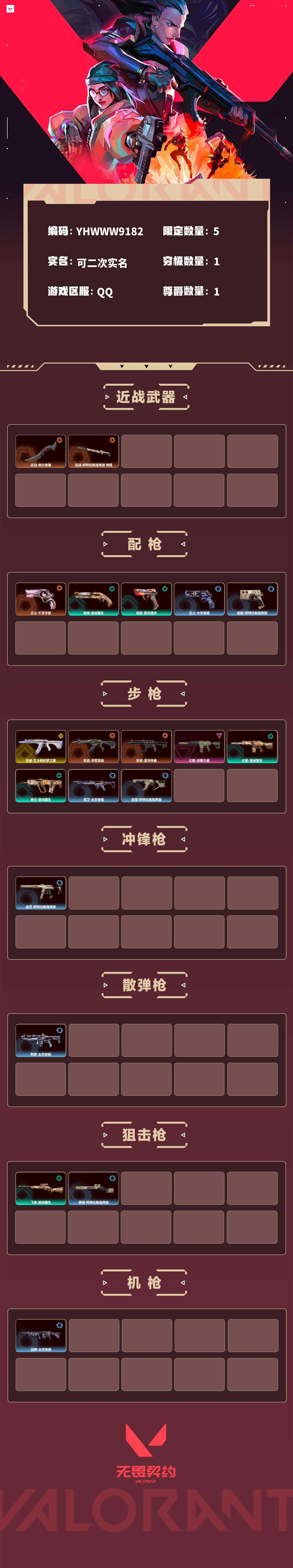 【无畏契约】【yhwww9182】等级:42,已用无畏点11630,已用源晶点295,金皮:狂徒-艾沃莉的梦之翼__橙皮:近战-夜刃诡镰|狂徒-洪荒怒焰|狂徒-混沌序曲|正义-千灵华绽|近战-阿特拉斯指挥部 甩棍__紫皮:幻影-侦察力量__段位:青铜__蓝皮:正义-太空穿梭|战神-太空穿梭|判官-太空穿梭|戍卫-太空穿梭|骇灵-阿特拉斯指挥部|莽侠-阿特拉斯指挥部|标配-阿特拉斯指挥部|狂徒-阿特拉斯指挥部__绿皮:短炮-悠闲猫生|飞将-悠闲猫生|幻影-悠闲猫生|獠犬-悠闲猫生|标配-星际猎兵__英雄:尚勃勒|维斯|黑梦|暮蝶|壹决|幽影|夜露|炼狱|铁臂|贤者|猎枭|芮娜|零|捷风|不死鸟|禁灭