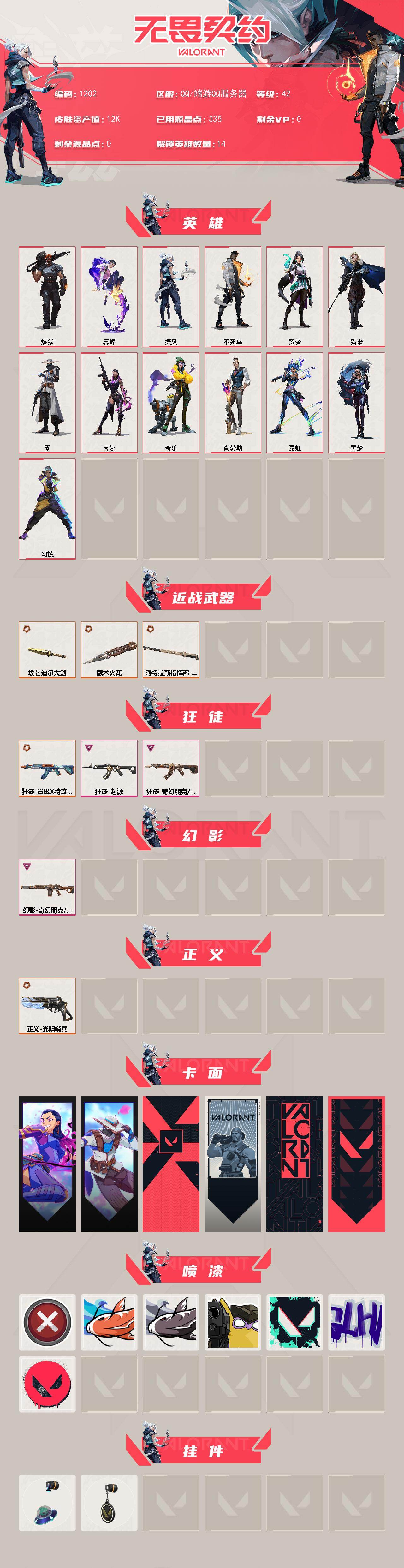 【英雄】:幻棱,炼狱,暮蝶,捷风,不死鸟,贤者,猎枭,零,芮娜,奇乐,尚勃勒,霓虹,黑梦 【近战武器】:近战武器-魔术火花,近战武器-埃芒迪尔大剑,近战武器-阿特拉斯指挥部 甩棍,近战武器-魔术火花 【狂徒】:狂徒-滋滋x特攻队,狂徒-起源,狂徒-奇幻朋克//3.0 【幻影】:幻影-奇幻朋克//3.0 【正义】:正义-光明哨兵 【卡面】:无畏契约go!第一卷:芮娜 卡面,无畏契约go!第一卷: