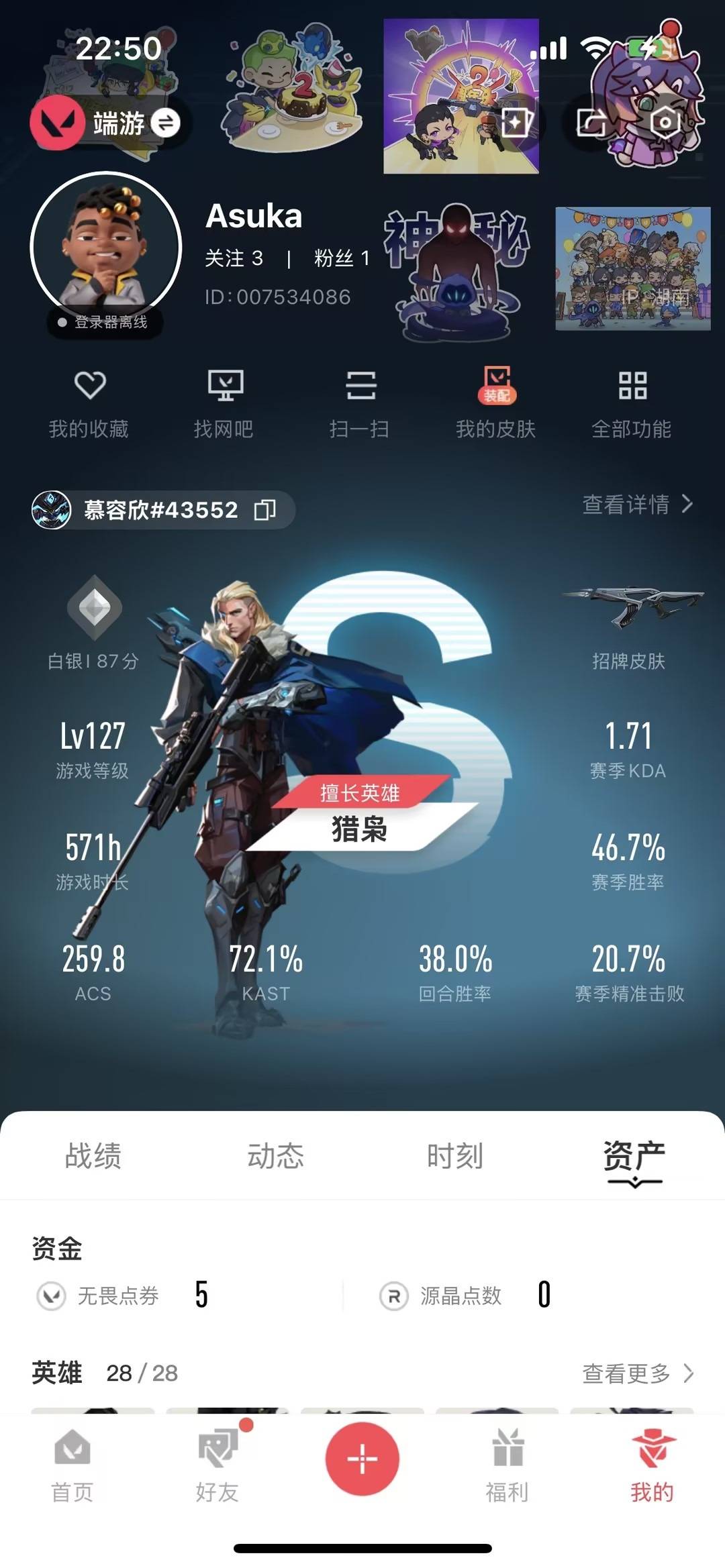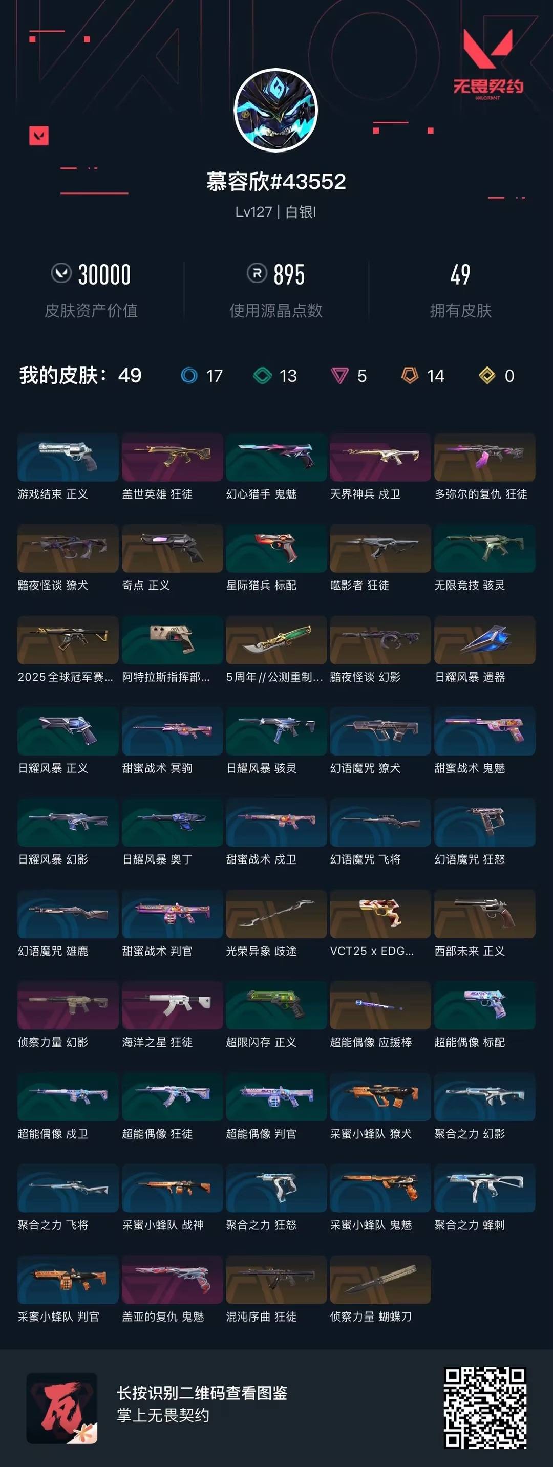 [16388576]14橙皮 5紫皮 49皮肤 28英雄 93卡面 895已用源晶 白银段位 【近战武器皮肤】苍龙之刃歧途蝴蝶刀-侦察力量超能偶像 应援棒日耀风暴 遗器 【佩呛皮肤】正义-奇点正义-西部未来鬼魅-盖亚的复仇标配-vct25xedg 【步呛皮肤】狂徒-海洋之星多弥