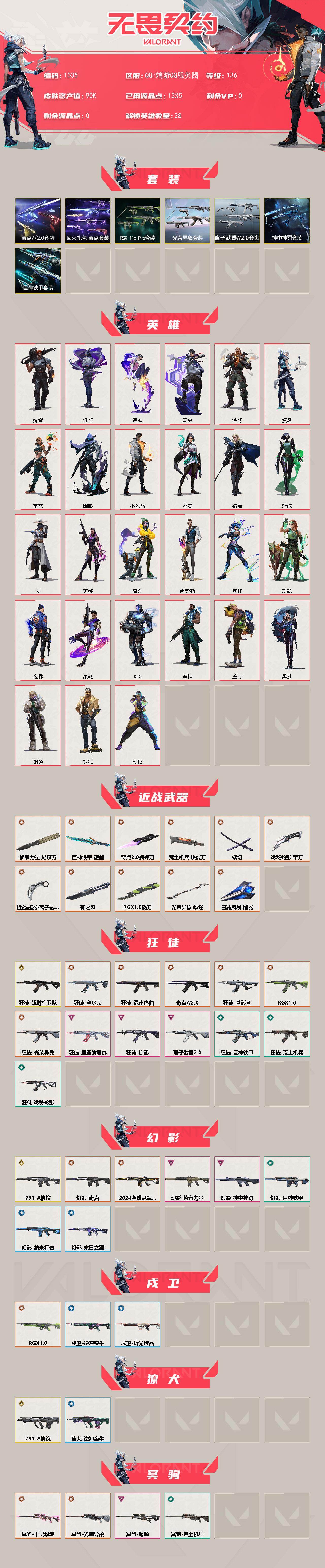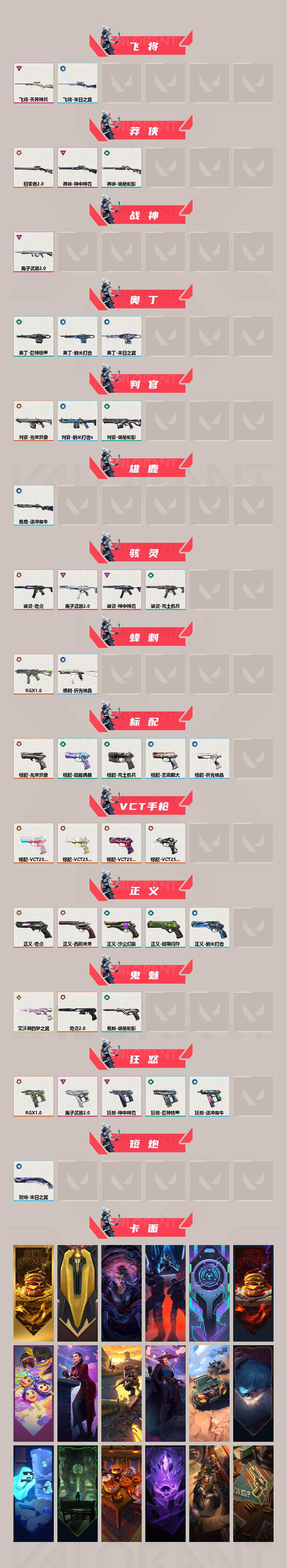 【套装】:光荣异象套装,rgx 11z pro套装,奇点//2.0套装,回火礼包:奇点套装,离子武器//2.0套装,神中神罚套装,巨神铁甲套装 【英雄】:幻棱,炼狱,维斯,暮蝶,钛狐,壹决,铁臂,捷风,雷兹,幽影,不死鸟,贤者,猎枭,蝰蛇,零,芮娜,奇乐,尚勃勒,霓虹,斯凯,夜露,星礈,k/o,海神,盖可,黑梦,钢锁 【近战武器】:近战武器-光荣异象 歧途,近战武器-rgx 11z pro 战刀,近战武器-神之刃,近战武器-侦察力量 蝴蝶刀,近战武器-奇点//2.0 蝴蝶刀,近战武器-镭切,近战武器-离子武器//2.0 爪刀,近战武器-巨神铁甲 短剑,近战武器-荒土机兵 热能刀,近战武器-诡秘蛇影 军刀,近战武器-日耀风暴 遗器 【狂徒】:狂徒-超时空卫队,狂徒-混沌序曲,狂徒-奇点//2.0,狂徒-塑水宗,狂徒-噬影者,狂徒-rgx 11z pro,狂徒-光荣异象,狂徒-掠影,狂徒-盖亚的复仇,狂徒-离子武器//2.0,狂徒-荒土机兵,狂徒-巨神铁甲,狂徒-诡秘蛇影 【幻影】:幻影-781-a协议,幻影-2024全球冠军赛,幻影-奇点,幻影-侦察力量,幻影-神中神罚,幻影-巨神铁甲,幻影-纳米打击,幻影-末日之翼 【戍卫】:戍卫-rgx 11z pro,戍卫-逆冲蛮牛,戍卫-折光棱晶 【獠犬】:獠犬-781-a协议,獠犬-逆冲蛮牛 【冥驹】:冥驹-千灵华绽,冥驹-光荣异象,冥驹-起源,冥驹-荒土机兵 【飞将】:飞将-天界神兵,飞将-末日之翼 【莽侠】:莽侠-归零者//2.0,莽侠-神中神罚,莽侠-诡秘蛇影 【战神】:战神-离子武器//2.0 【奥丁】:奥丁-巨神铁甲,奥丁-纳米打击,奥丁-末日之翼 【判官】:判官-光荣异象,判官-诡秘蛇影,判官-纳米打击x 【雄鹿】:雄鹿-逆冲蛮牛 【骇灵】:骇灵-奇点,骇灵-离子武器//2.0,骇灵-神中神罚,骇灵-荒土机兵 【蜂刺】:蜂刺-rgx 11z pro,蜂刺-折光棱晶 【标配】:标配-光荣异象,标配-超能偶像,标配-荒土机兵,标配-艺高胆大,标配-折光棱晶 【vct手呛】:标配-vct25 x blg,标配-vct25 x th,标配-vct25 x tln,标配-vct25 x ts 【正义】:正义-奇点,正义-西部未来,正义-超限闪存,正义-沙尘幻旅,正义-纳米打击 【鬼魅】:鬼魅-艾沃莉的梦之翼,鬼魅-奇点//2.0,鬼魅-诡秘蛇影 【狂怒】:狂怒-rgx 11z pro,狂怒-离子武器//2.0,狂怒-神中神罚,狂怒-巨神铁甲,狂怒-逆冲蛮牛 【短炮】:短炮-末日之翼 【卡面】:终章:激斗汉堡 卡面,进入射程 卡面,分崩离析 卡面,纳米打击 卡面,抑制技术 卡面,激斗汉堡 卡面,瓦娃脸雪糕 p2 卡面,从黄昏到黎明 卡面,荒土机兵 卡面,银弹猎手 卡面,逆冲蛮牛 卡面,《双城之战》拥抱 卡面,精灵大战 卡面,欢迎来到底城 卡面,南瓜盛典 卡面,奇点//2.0 卡面,修车达人 卡面,正义的化身 卡面,终章:生意人麦宝 卡面,铁之华 卡面,时间到 卡面,最高舞台 卡面,声感陷阱设计图 卡面,风险合作 卡面,梦幻奶茶 卡面,无畏契约:尚勃勒 卡面,零点嗅探设计图 卡面,夜班 卡面,无畏契约go!第一卷:芮娜 卡面,清除名单 卡面,无畏契约go!第一卷:零 卡面,龍记 卡面,《双城之战》金克丝 卡面,完美调谐 卡面 ,暗呛 卡面,铁臂vs雷兹 卡面,胡桃狂想 卡面,夯实根基 卡面,热烈欢迎 卡面,铁臂设计图 卡面,代号红色 卡面,冰淇淋店 卡面,新兵报到 卡面,友军火力 卡面,v契约 卡面,无畏契约 卡面 【喷漆】:小小心意 喷漆,战“素”兔 喷漆,宇宙的指引 喷漆,请求重启 喷漆,逆冲蛮牛 喷漆,纳米打击 喷漆,鼻尖上的蝴蝶 喷漆,简笔画黯兽 喷漆,独守蝰腹 喷漆,他们将落荒而逃 喷漆,通缉:战术企鹅 喷漆,荒土机兵 喷漆,别挡我吃球! 喷漆,嗨宝南瓜灯 喷漆,嘭! 喷漆,都算到了 喷漆,控场勿近 喷漆,小丑猫 喷漆,奇点//2.0 喷漆,熊抱 喷漆,超级粉丝 喷漆,捷风差距 喷漆,惊声尖叫 喷漆,超能偶像 喷漆,拼一呛 喷漆,尚勃勒 喷漆,分身有术 喷漆,致命优雅 喷漆,买装还是存钱 喷漆,醒狮贺春 喷漆,关门放狗 喷漆,无畏契约go!第一卷:芮娜 喷漆,红鳞 喷漆,无畏契约go!第一卷:零 喷漆,无畏契约go!第一卷:捷风 喷漆,无畏契约go!第一卷:贤者 喷漆,暴走萝莉 喷漆,松叶 喷漆,无畏契约go!第一卷:奇乐 喷漆,蕊形灯 喷漆,凌空惊吓 喷漆,老铁困了 喷漆,口袋贤者 喷漆,胜利属于无畏契约 喷漆,glhf 喷漆,无畏契约 喷漆 【挂饰】:终章:猫猫木乃伊 挂饰,荒土机兵 挂饰,悠闲鸡块 挂饰,猫猫木乃伊 挂饰,水壶 挂饰,纳米打击 挂饰,逆冲蛮牛 挂饰,可爱糖糖 挂饰,伞绳 挂饰,《双城之战》小蛋糕 挂饰,第九季//第三幕 纪念币 挂饰,工具腰带 挂饰,奇点//2.0 挂饰,鱼骨头 挂饰,熔岩灯 挂饰,第九季//第二幕 纪念币 挂饰,终章:这瓜保熟 挂饰,糖葫芦 挂饰,袖珍捷风 挂饰,迷你浓缩 挂饰,第九季//第一幕 纪念币 挂饰,有事联系 挂饰,第八季//第三幕 纪念币 挂饰,天外飞客 挂饰,好运福爪 挂饰,红鳞松叶 挂饰,《双城之战》魄罗 挂饰,瞄这里 挂饰,第八季//第一幕 纪念币 挂饰,第七季:青铜 挂饰,终章:高音谱号 挂饰,彩糖面包 挂饰,冬日絮语 挂饰,第七季//第三幕 纪念币 挂饰,幸运中国结 挂饰,第七季//第二幕 纪念币 挂饰,无畏契约 纪念币 挂饰