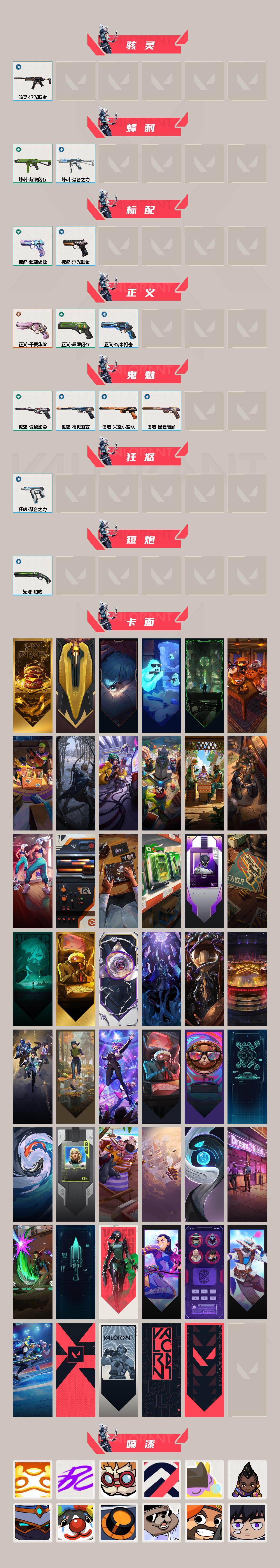 【英雄】:幻棱,炼狱,维斯,暮蝶,钛狐,壹决,铁臂,捷风,雷兹,幽影,不死鸟,贤者,猎枭,蝰蛇,零,芮娜,奇乐,尚勃勒,霓虹,斯凯,夜露,星礈,k/o,海神,盖可,黑梦,钢锁 【近战武器】:近战武器-5周年//公测重制版 苍龙之刃,近战武器-侦察力量 蝴蝶刀,近战武器-紫金爪刀,近战武器-澄湖潋滟,近战武器-超能偶像 应援棒,近战武器-超限闪存 匕首 【狂徒】:狂徒-混沌序曲,狂徒-塑水宗,狂
