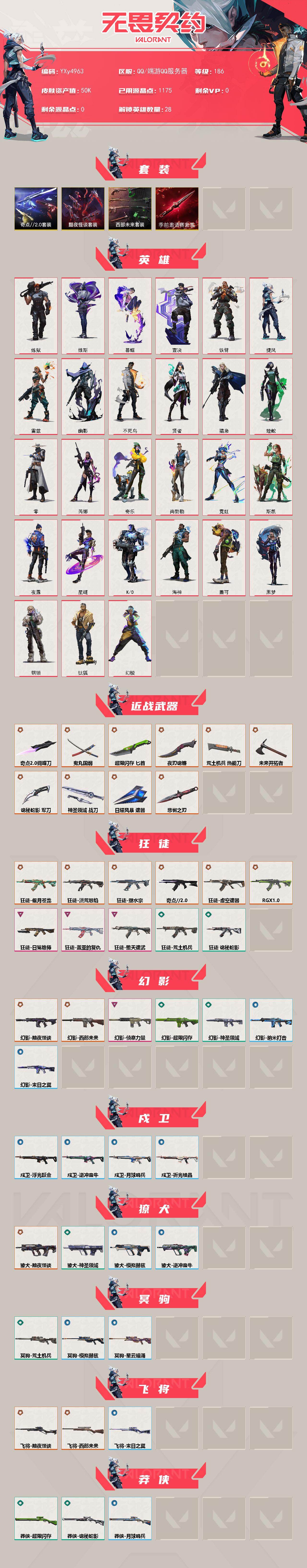 【5w库存古神套.怜悯之刃.奇点2.0套装.西部套.九狂徒三幻影青龙.流脓.塑水宗.虚空.显卡.狮子.盖亚.弃王】y4963【可二次】【因赛季更新游戏段付以上号为准!】 【套装】:无畏契约季前邀请赛套装,西部未来套装,奇点//2.0套装,黯夜怪谈套装 【英雄】:幻棱,炼狱,维斯,暮蝶,钛狐,壹决,铁臂,捷风,雷兹,幽影,不死鸟,贤者,猎枭,蝰蛇,零,芮娜,奇乐,尚勃勒,霓虹,斯凯,夜露,星