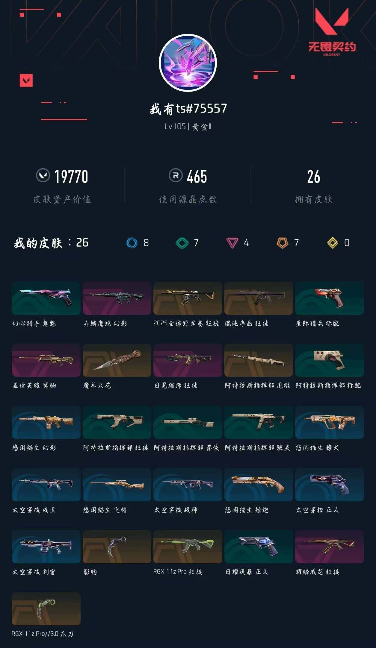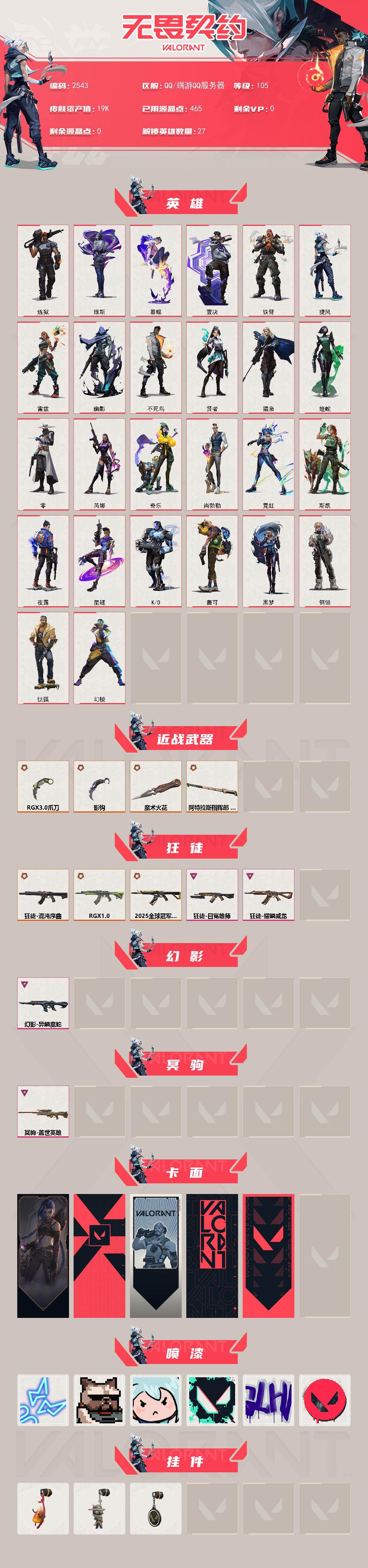 [16532063]【英雄】:幻棱,炼狱,维斯,暮蝶,钛狐,壹决,铁臂,捷风,雷兹,幽影,不死鸟,贤者,猎枭,蝰蛇,零,芮娜,奇乐,尚勃勒,霓虹,斯凯,夜露,星礈,k/o,盖可,黑梦,钢锁 【近战武器】:近战武器-魔术火花,近战武器-影钩,近战武器-rgx 11z pro//3.0 爪刀,近战武器-阿特拉斯指挥部 甩棍,近战武器-魔术火花 【狂徒】:狂徒-2025全球冠军赛,狂徒-混沌序曲,狂徒-rgx 11z pro,狂徒-日冕雄师,狂徒-耀鳞威龙 【幻影】:幻影-异鳞魔蛇 【冥驹】:冥驹-盖世英雄 【卡面】:《双城之战》金克丝 卡面,代号红色 卡面,新兵报到 卡面,v契约 卡面,无畏契约 卡面 【喷漆】:霓光四射 喷漆,关门放狗 喷漆,飓刃涂鸦 喷漆 ,胜利属于无畏契约 喷漆,glhf 喷漆,无畏契约 喷漆 【挂饰】:可爱糖糖 挂饰,无畏契约go!第一卷 零 挂饰,无畏契约 纪念币 挂饰