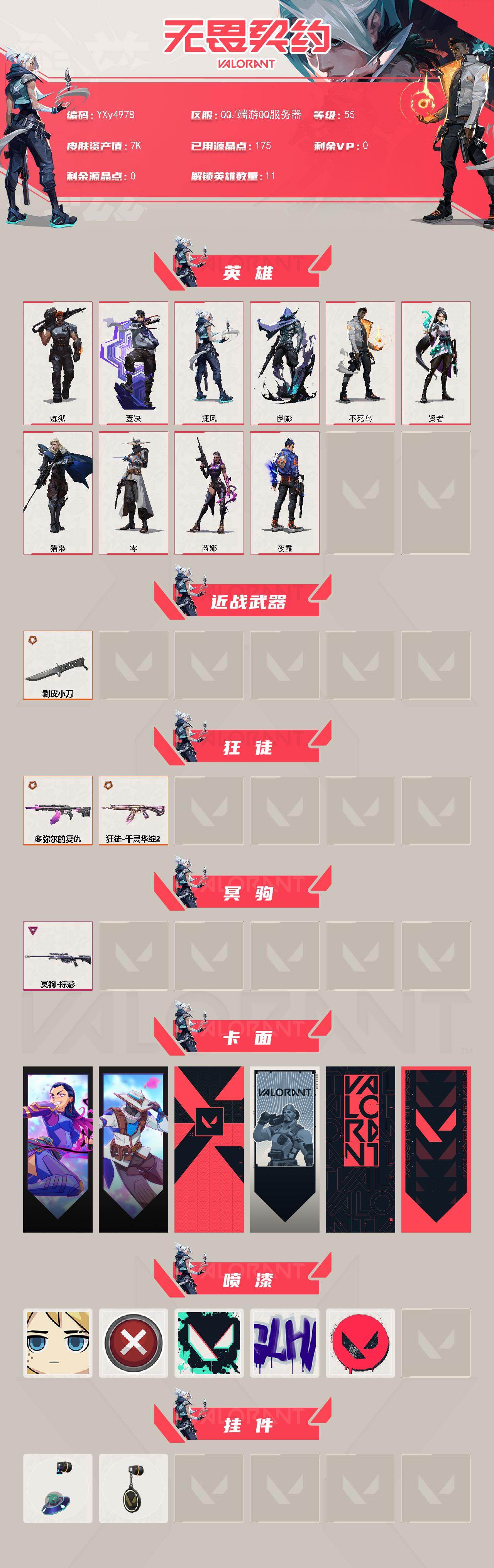 【英雄】:炼狱,壹决,捷风,幽影,不死鸟,贤者,猎枭,零,芮娜,夜露 【近战武器】:近战武器-剥皮小刀 【狂徒】:狂徒-多弥尔的复仇,狂徒-千灵华绽//2.0 【冥驹】:冥驹-掠影 【卡面】:无畏契约go!第一卷:芮娜 卡面,无畏契约go!第一卷:零 卡面,代号红色 卡面,新兵报到 卡面,v契约 卡面,无畏契约 卡面 【喷漆】:当然可以 喷漆,买装还是存钱 喷漆,胜利属于无畏契约 喷漆,glh