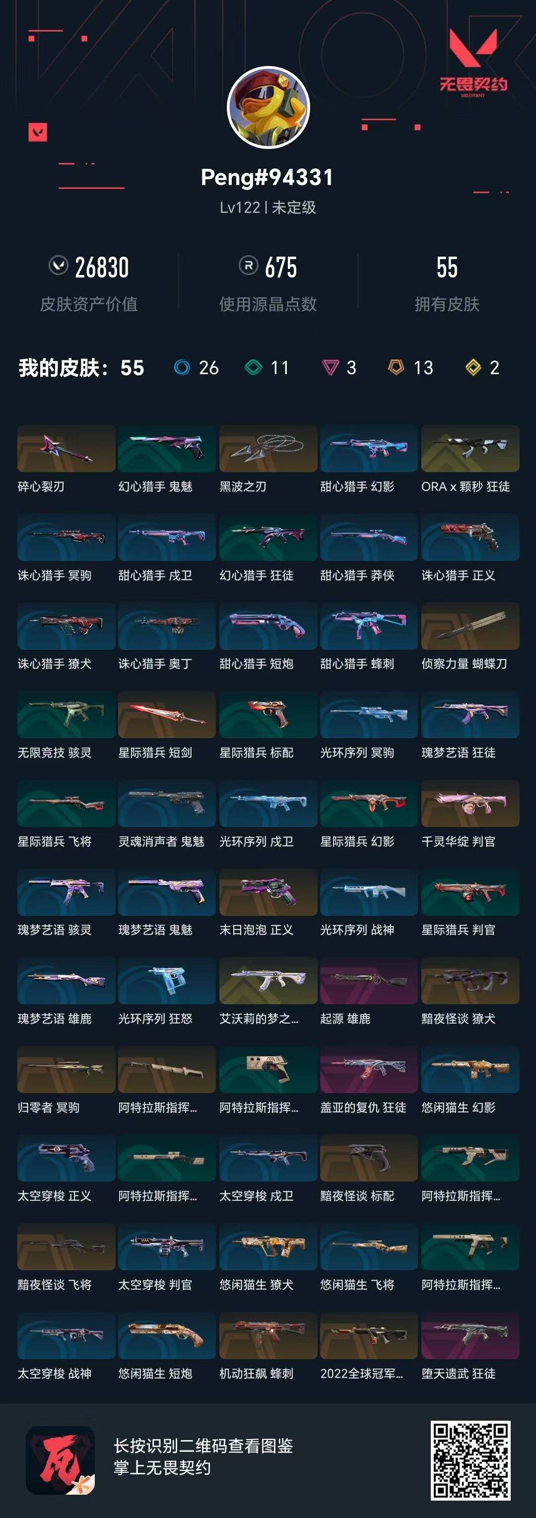 13橙皮 2金皮 3紫皮 55皮肤 17英雄 72卡面 675已用源晶 未定级段位 【近战武器皮肤】阿特拉斯指挥部星际猎兵 短剑碎心裂刃黑波之刃蝴蝶刀-侦察力量 【佩呛皮肤】正义-末日泡泡标配-黯夜怪谈 【冲锋呛皮肤】蜂刺-机动狂飙 【霰弹呛皮肤】判官-千灵华绽雄鹿-起源 【步呛皮肤】