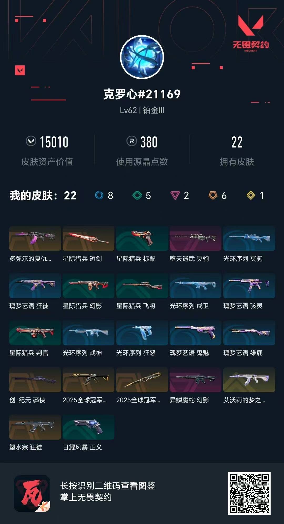 [16541321]6橙皮 1金皮 2紫皮 22皮肤 14英雄 47卡面 380已用源晶 铂金段位 【套装】2025全球冠军赛 【近战武器皮肤】星际猎兵 短剑2025全球冠军赛 蝴蝶刀 【步呛皮肤】幻影-异鳞魔蛇多弥尔的复仇 狂徒2025全球冠军赛 狂徒狂徒-艾沃莉的梦之翼狂徒-塑水宗 【狙击呛皮肤】莽侠-创·纪元冥驹-堕天遗武 【挂饰】v25第六幕:超凡 挂饰2025全球冠军赛挂饰v26第一幕纪念币 挂饰